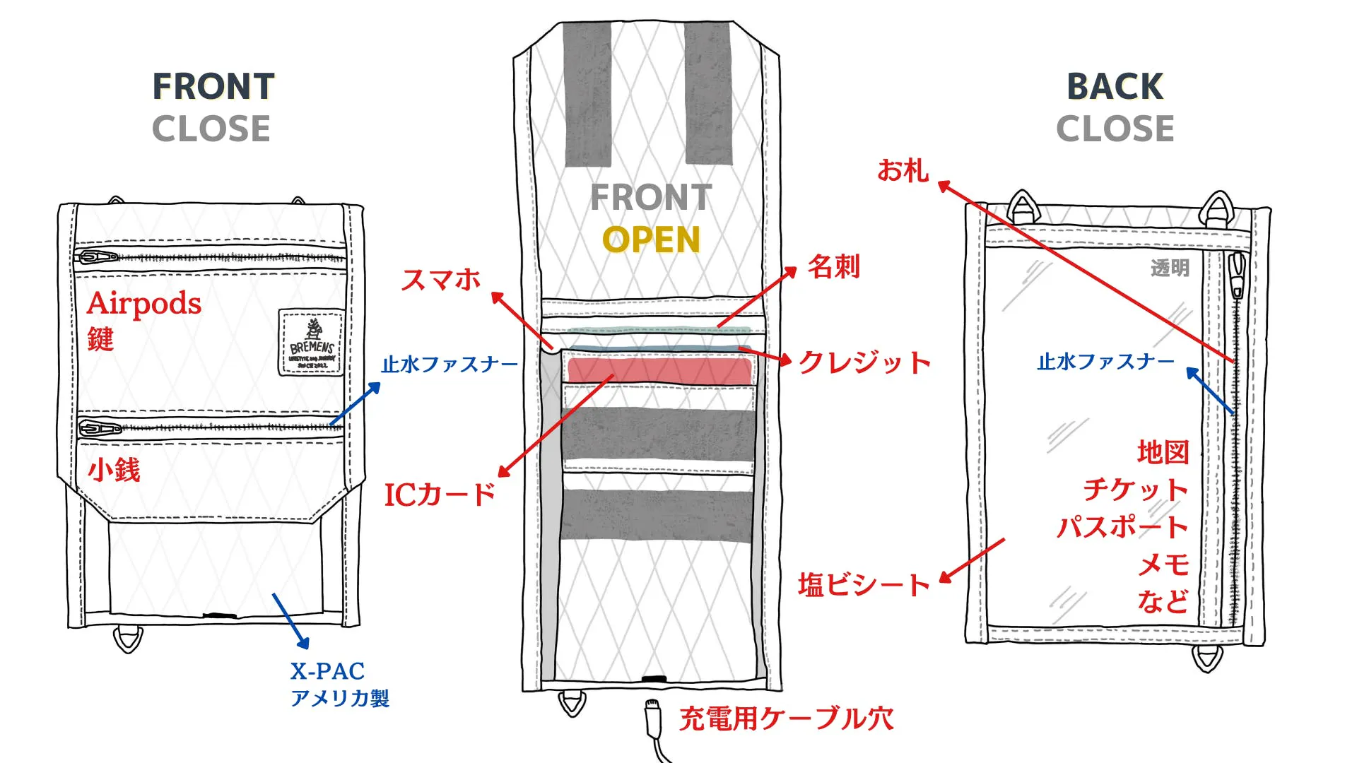 旅や登山、キャンプなどアウトドアはもちろんですが、日常生活のあらゆるシーンも想定して設計しています。(お金の取り出しやすさ、ICカードや小銭の位置など)。前職で外国人ゲストをご案内している時、狭い市場で急いで買い物をしなければならない場面が多く、そんな時、こんな商品があれば良いなと思っていました。その経験も今回のものづぐりに活かしています。また、災害などの緊急時には貴重品をいち早く持ち出す必要がありますが、そんな時にも役に立てることを願って作りました。