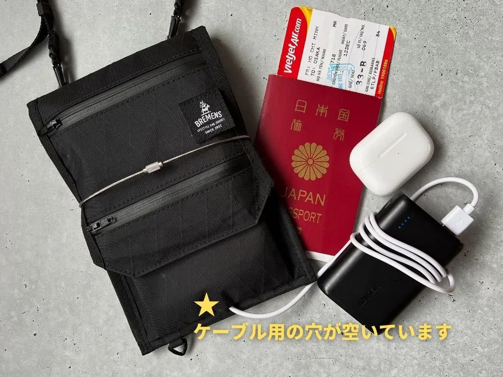 長距離移動中のバスや電車の中で、ポーチに収納したままスマホを充電したり、イヤホンを挿して音楽を聞いたりできるように、本体底にケーブル用の穴を設置しました。これでスリから身を守りながら睡眠が取れます。