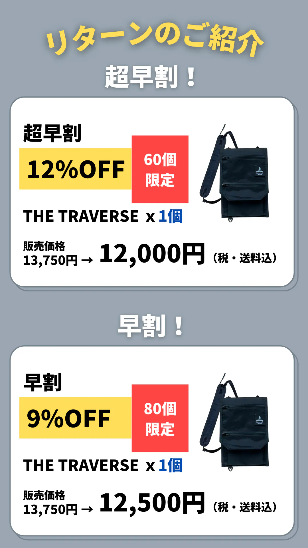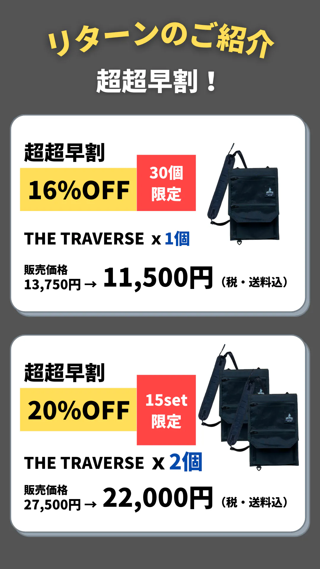 第一回目の国内クラウドファンディングでは、コロナ禍にも関わらず525名のご支援をいただいて目標金額を大幅に上回り、660万円を超えることができました。終了後の今もお問い合わせが続いていること、また、より多くの場で「THE TRAVERSE」を知って頂きたい、という思いも含めて今回CAMPFIREにて掲載をさせていただくことになりました。