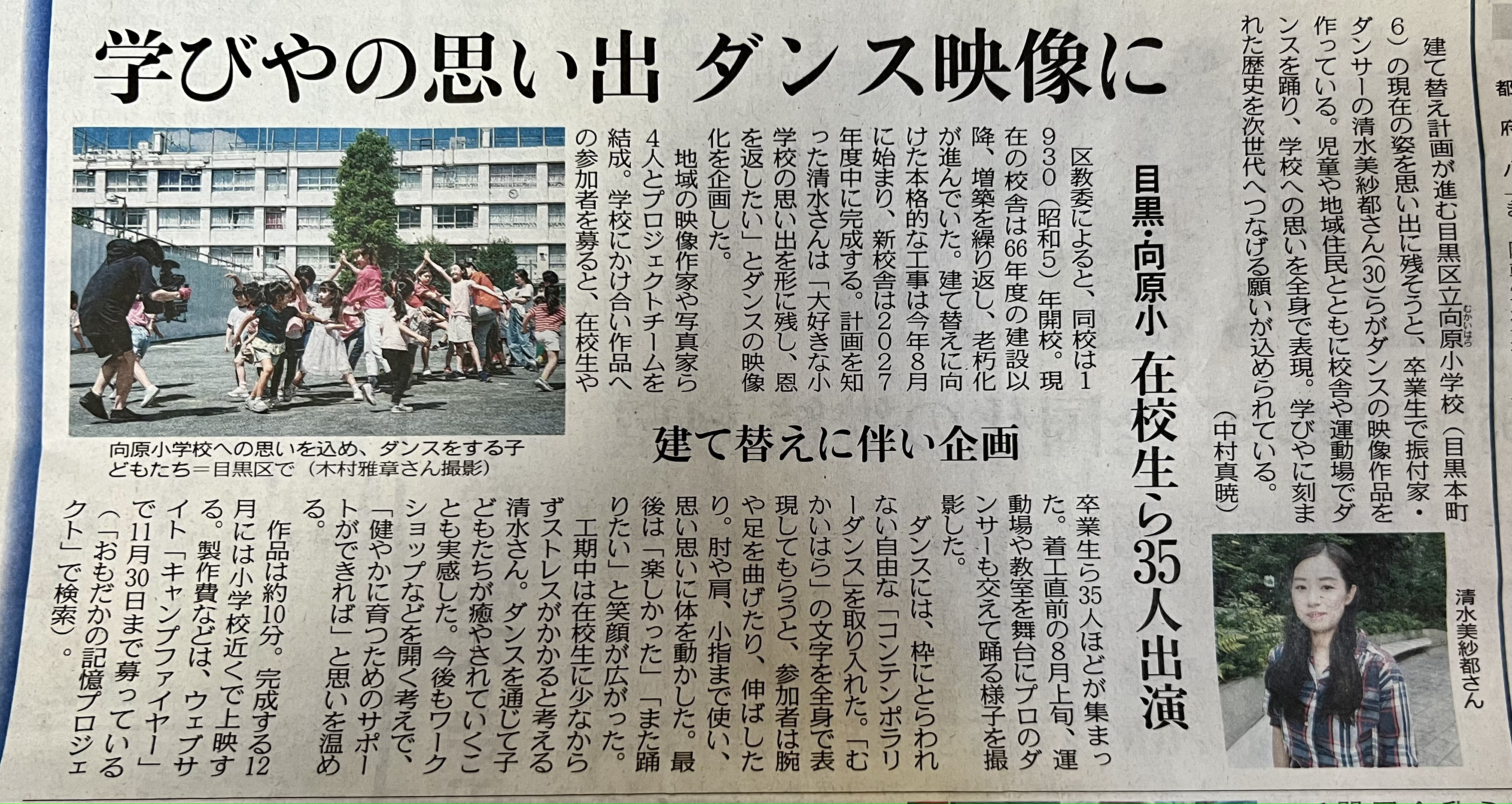 創立94年の目黒区立向原小学校は、約5年計画で新校舎建設を予定しており、2023年夏から校舎の建て直し作業を始めました。向原小学校の旧校舎には、在校生や卒業生の何十年来の記憶が宿っているはずです。記憶や思い出の断片を、何らかの形で未来へ遺せないかという思いから本企画を発案しました。活動の集大成としては、動きのあるダンス映像作品を創作します。向原小学校卒業生のコンテンポラリーダンスアーティスト、清水美紗都が企画し、在校生・卒業生や地域住民、地域にゆかりのあるアーティストやプロダンサーが一丸となって出演するダンス映像作品を創りたいと思っています。