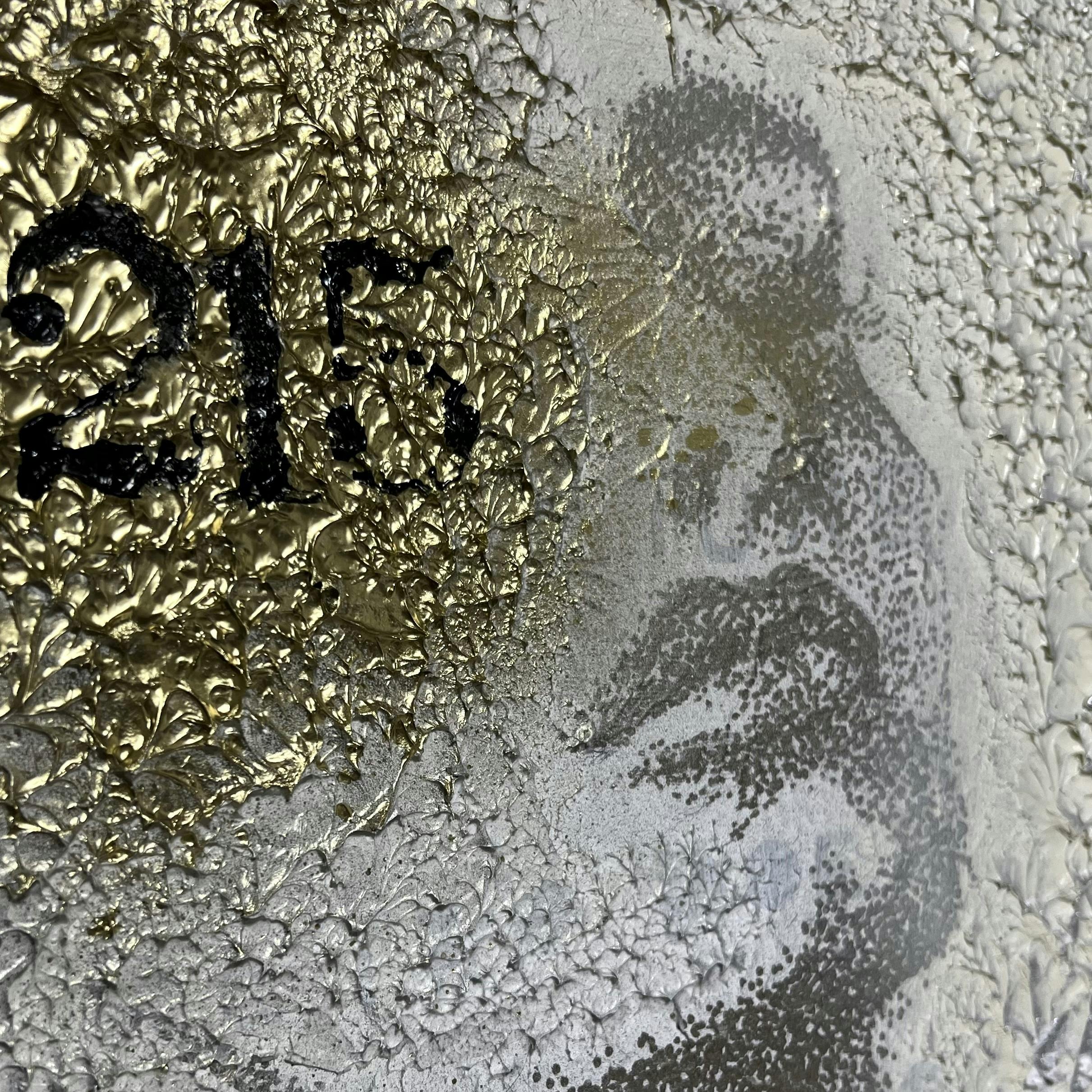 金色の点描画を用い、光の角度でその点描画が見えたり見えなくなったり表情を変え、