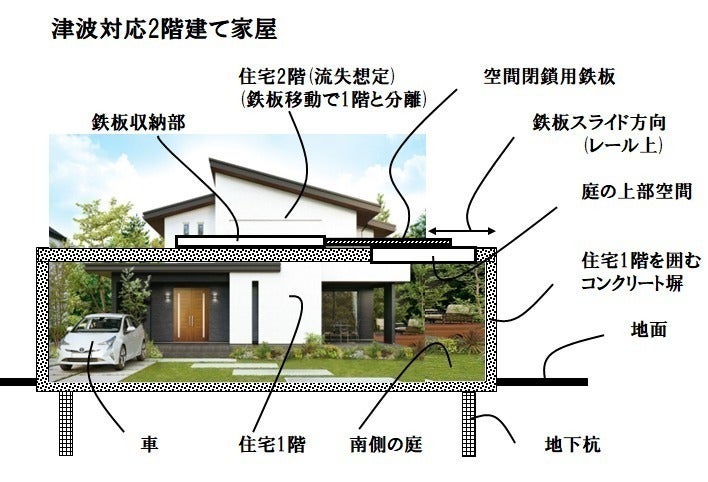 住み慣れた元の場所に住むことのできる安全な街区の復活につながる津波対策が求められている。行政と住民との両者の主張をくんだ実用的な津波対策に繋がる津波シェルターの実現は全国的な重要課題となっている。また、大津波が予想される東海や南海、四国地方の沿岸住民に対する津波対策として避難タワー等が各地に設置されているが、津波到達時間が10分以下の津波も予想され、その時は避難が間に合わない。さらに、高齢者や車椅子、子供等の避難弱者にとって遠くの避難所への避難は非常に困難であり、深夜や雨、雪等の環境での避難は躊躇することになる。高所への避難は津波対策の最良策であり最も確実で安全なものではあるが、躊躇していて逃げ遅れた人々を救う最後の手段として、より簡単で、避難しやすく、建設費の安い津波シェルターが求められている。現在市販されている浮上方式の津波シェルターは津波に翻弄され、沖に流されるので、収容した避難者へのダメージが大きく安全性に問題があると共に、被災後の再建には役立たない。 また、避難タワーの建設は工事費が高価であり、用地確保も困難で、危険区域全世帯をカバーするだけの数を構築することは不可能に近く、工事がとどこおっている。特に、東北被災地では災害危険区域では住宅家屋の新築が禁止され、いまだに放置された空地が目立ち、草刈等の管理維持費が自治体の大きな負担となっている。 今回開発中の水没式家屋型の津波シェルターによれば、平常時から戸建て住宅として居住し、被災してもすぐに居住を続けることが可能になります。 被災後の避難所生活が不要で、仮設住宅も不要です。 住む家や車等、津波による1000万円以上の損失がまぬがれ、被災後の生活に必要な冷凍冷蔵庫や食材、エアコン、テレビ、トイレ、浴室、キッチン等家財が守られ、すぐに利用可能です。 津波に対応した家屋群で再興された街や集落は、街全体が流されずに保全され、街の商店街や住宅街が守られる。 電気、上下水道の損傷も少なく、インフラ設備も守られ、故郷の壊滅を避けられます。 さらに、水没式家屋型の津波シェルターは、津波避難タワーに代わる100人用津波シェルターとしても機能し、建設コストは1/10以下で、用地確保も容易です。 100名の食材3日分を備蓄し、良好な室内環境を避難所として利用できます。 再興の初期は100人用シェルターとして機能させれば、補助金100%で建設が可能。今回開発した水没式家屋型の津波シェルターにおける重要手段である鉄板スライドによる空間閉鎖機構部の製作と実証実験を行い、完成させた家屋型シェルターの実用化を目指します。 工事の施工は最寄りの工務店又は大手ハウスメーカーに依頼する予定で、技術的な問題点はあまりありません。津波シェルターを設置して安全を確保した住宅は、特例として新築が許可され、災害危険地域が住宅街として復活することを念願しています。今回のプロジェクトは、今年度内に模型による実証実験によって安全性を実証し、2024年内に最初の100人用津波シェルター1号基を建設する予定です。