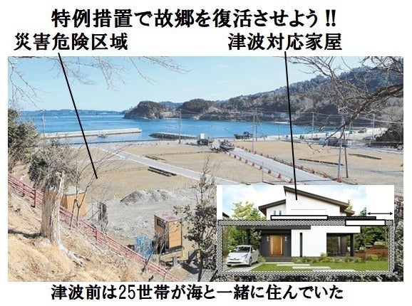 6) 津波避難タワーの代わりに100人用の津波対応住宅型津波シェルターが各地の自治体によって建設されることを期待している。建設費はタワーの1/10であり、建設用地の確保も容易。津波対応住宅は集会所として利用する。避難タワーに比べて階段を登る必要は無く、被災後も冷凍冷蔵庫やエアコン、テレビ、トイレ、浴室、台所等の設備がそのまま利用可能であって、数日間の滞在も可能。(避難タワーには無い)