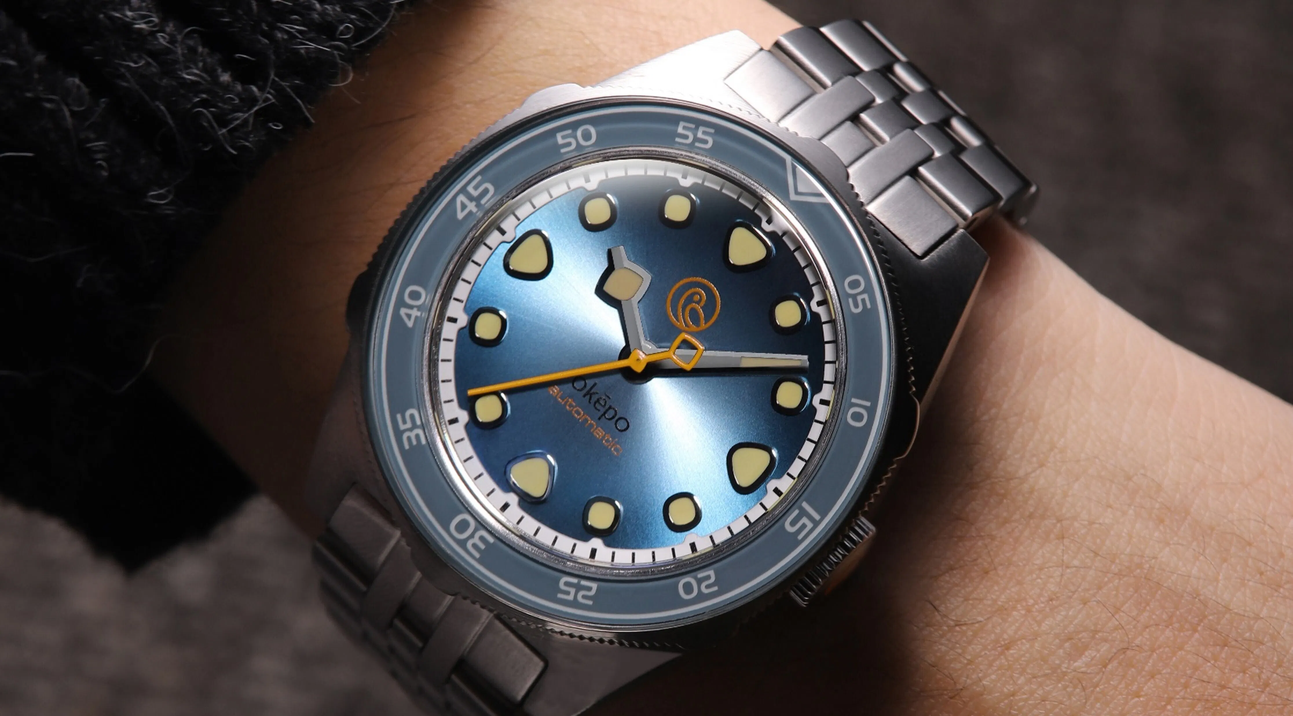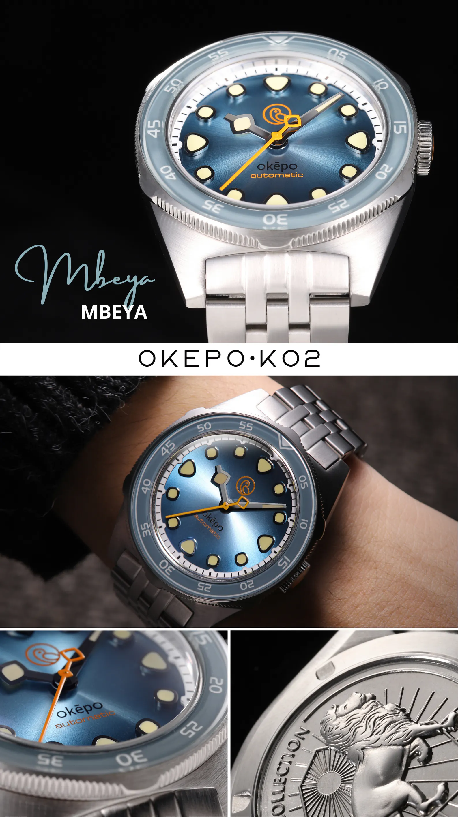 KO02“MBEYA”:スチールケース/ライトブルー光沢ダイヤル/グレーブルー・ベゼル