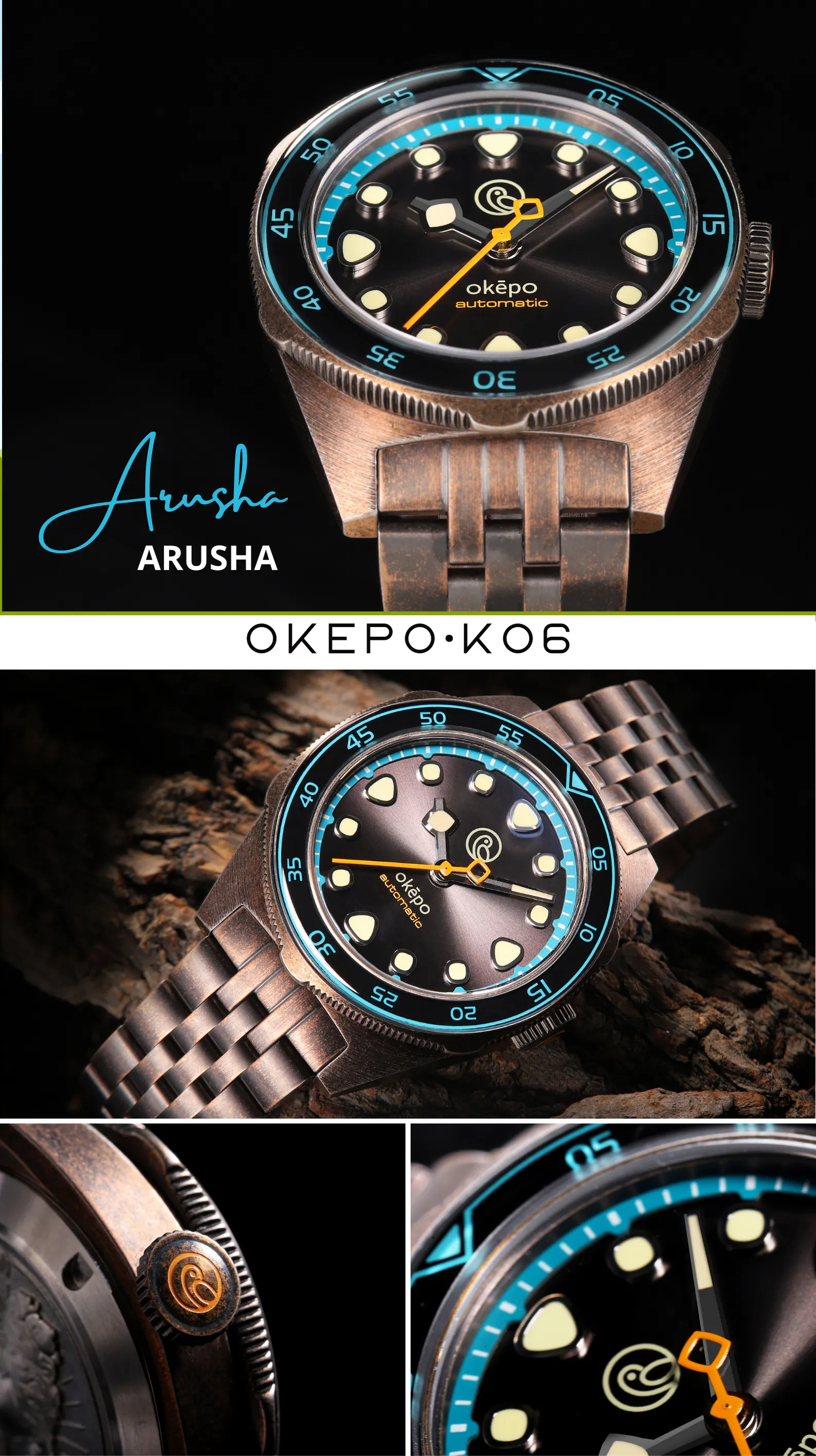 KO6“ARUSHA”:アンティークブラウンケース/ブラック光沢ダイヤル/ブラック・ベゼル