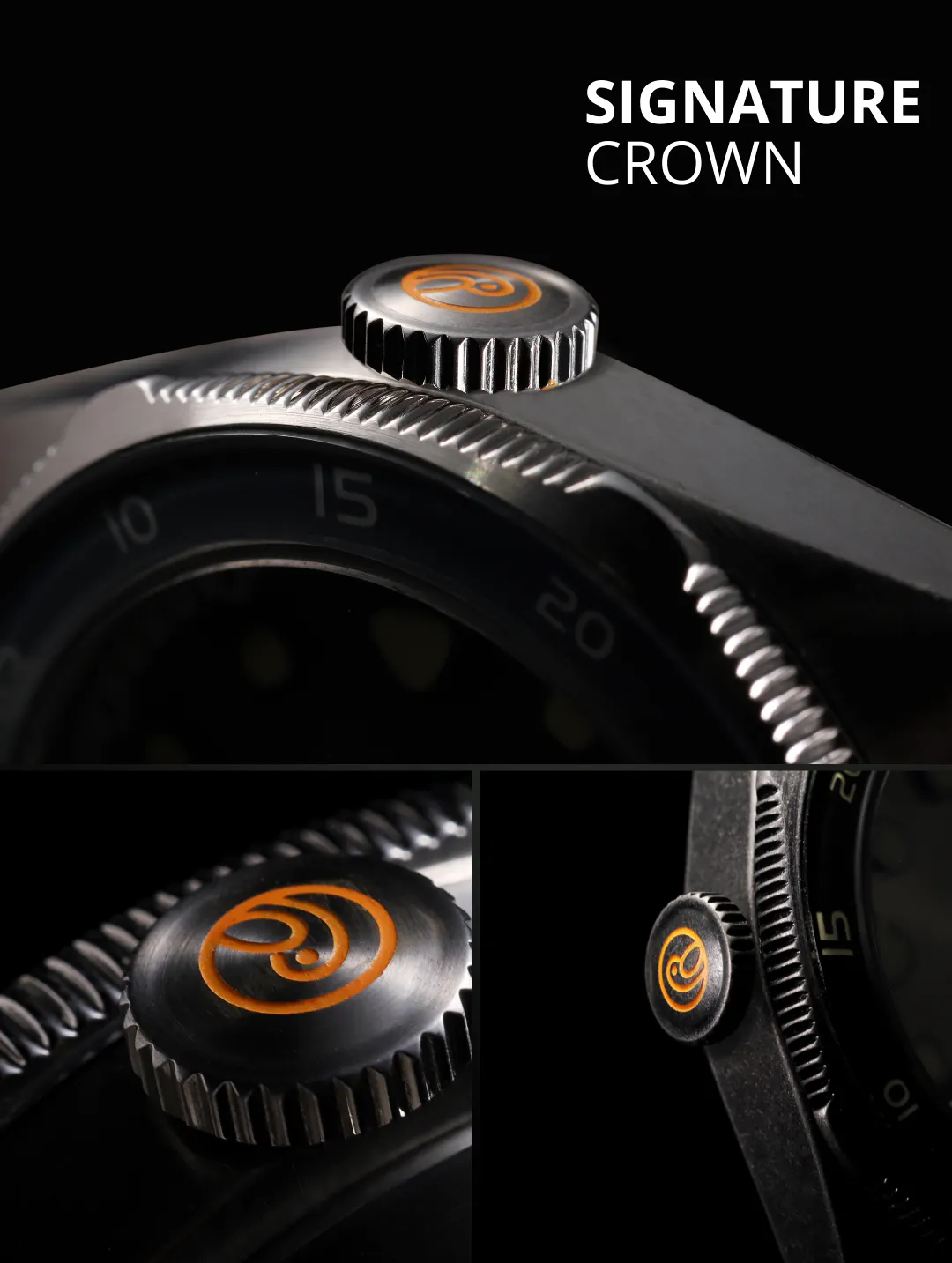 クラウンにはOKEPOのロゴが深く刻まれ、この時計のシンボルとなっています。 フラミンゴをイメージしたこの鮮やかなオレンジ色のロゴが、鮮烈な生命力を表現しています。