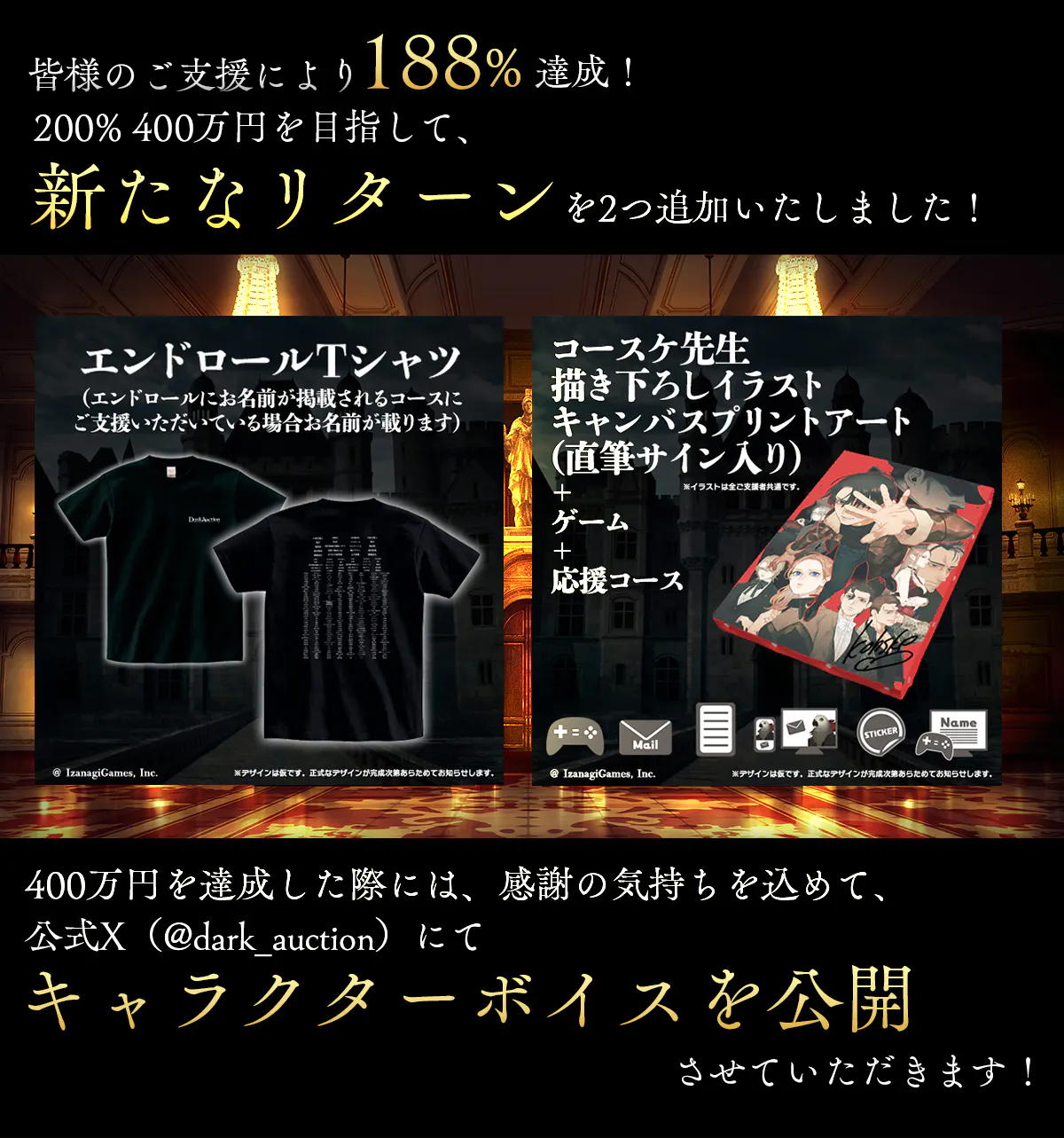 目標金額200万円を達成しました! 目標達成に伴い、ネクストゴール(目標金額:400万円、達成率200%)と新たなリターン「エンドロールTシャツ」「コースケ先生描き下ろしイラストキャンバスプリントアート(直筆サイン入り)」(※)の追加を発表いたしました。