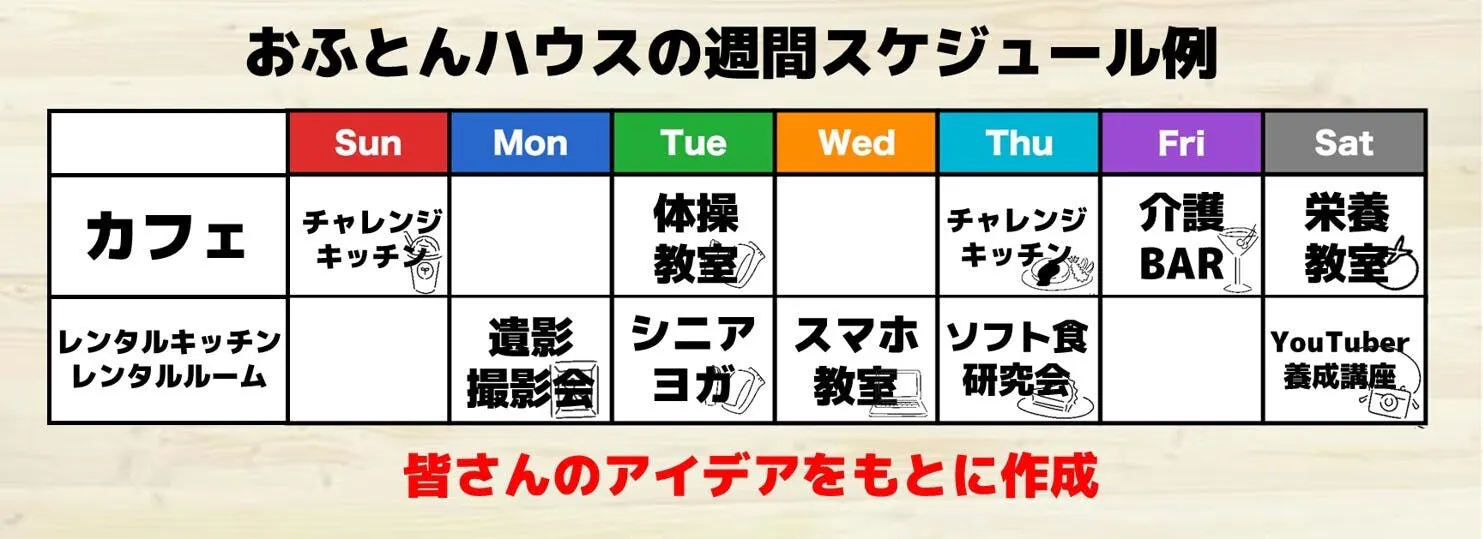 皆さんのアイデアをもとに、おふとんハウスの週間スケジュール例を考えてみました。