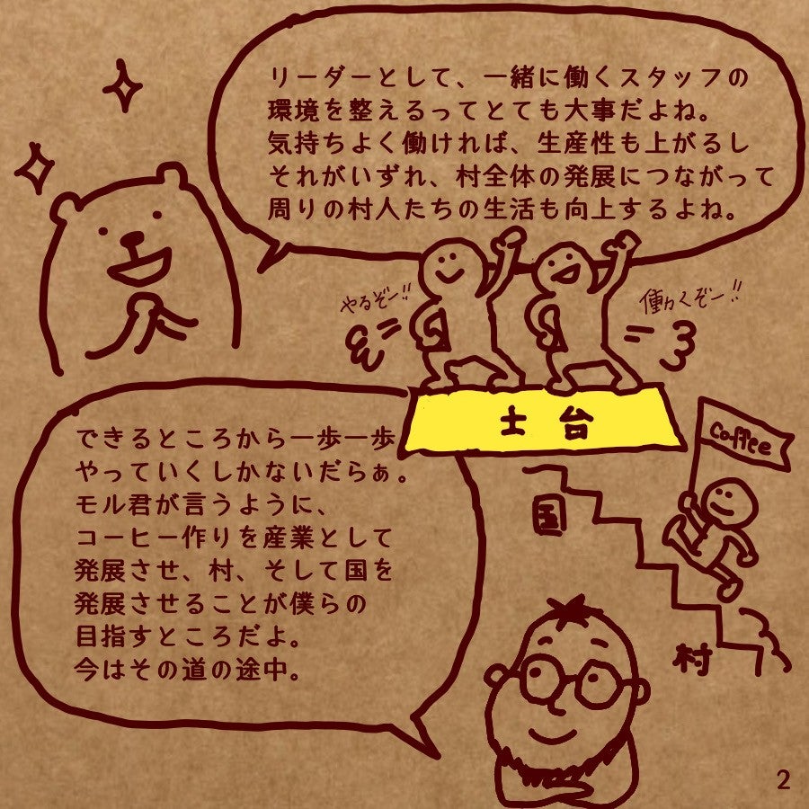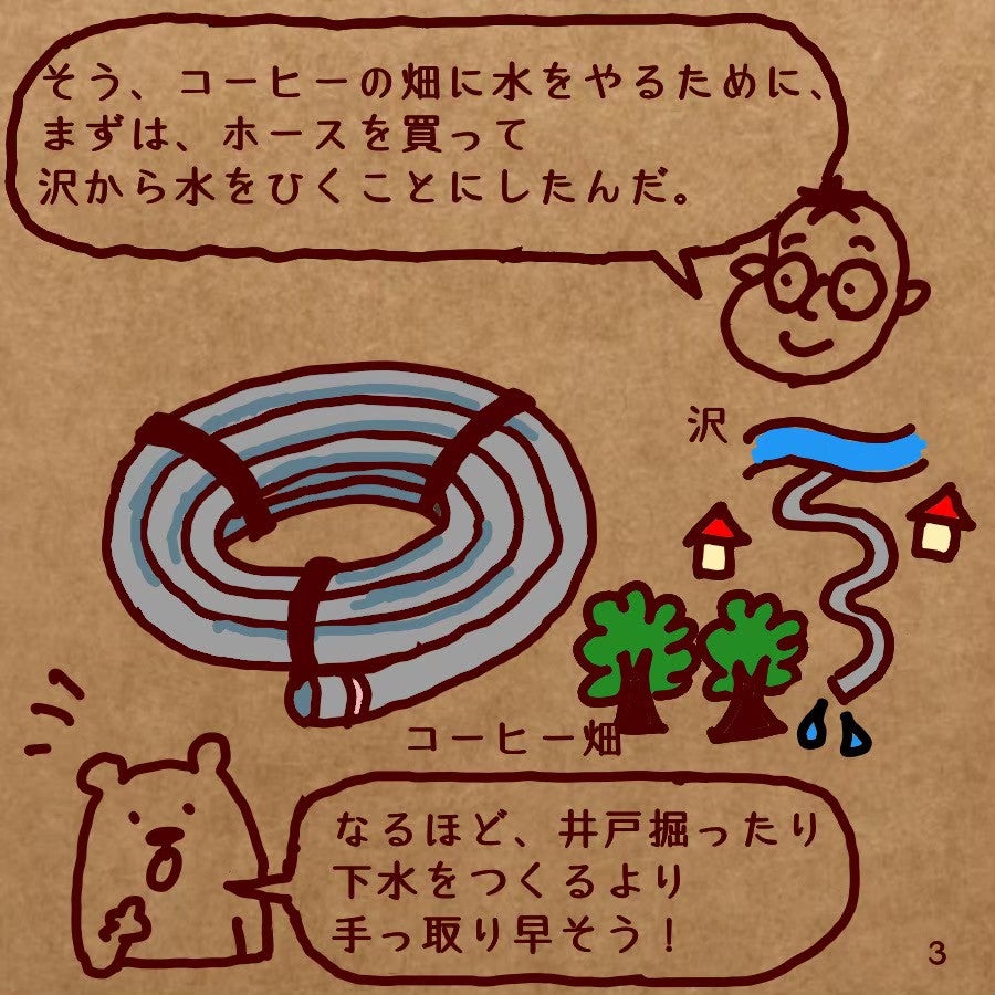 「他のコーヒーには無い付加価値を、誰かが代わりに伝えなければ!」そんな想いに突き動かされるように、私はオンラインショップのページを作り替え、活動報告を兼ねたマンスリーレターとブログの執筆も開始しました。そんな折、「コーヒーのドリップは子育てと一緒。育児本を見るより、目の前の子供を見るのが大事でしょ。」という池島さんの何気ない一言に、「うまいこと言うな!」と思い、面白半分で描いたのが漫画の第一話です。池島さんは、いつもの口癖、「スーパー素敵じゃん!」を連発して気に入って下さり、そのまま公式インスタグラムに投稿。ありがたいことに好評を得て、そのまま漫画連載を不定期で続けていくことになり、今に至ります。