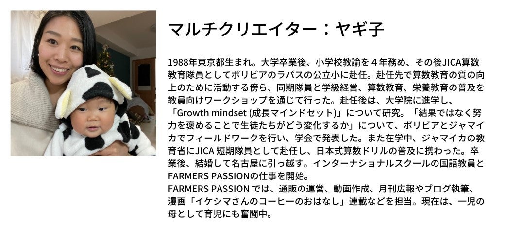 もともと小学校教員だった私がFARMERS PASSIONで働き始めたのは2020年の5月。ボリビアでの青年海外協力隊としての活動、大学院進学を経て結婚と共に愛知にやってきた私は、ご縁があって、夫の親友・池島さんの会社で、オンラインショップの運営を担うことになりました。教育とコーヒー栽培は、畑は違えど、目指す社会の在り方は同じだと感じたこと、ネパールにコーヒー産業を興した池島さんの行動力に感銘を受け、お手伝いさせていただくことにしました。