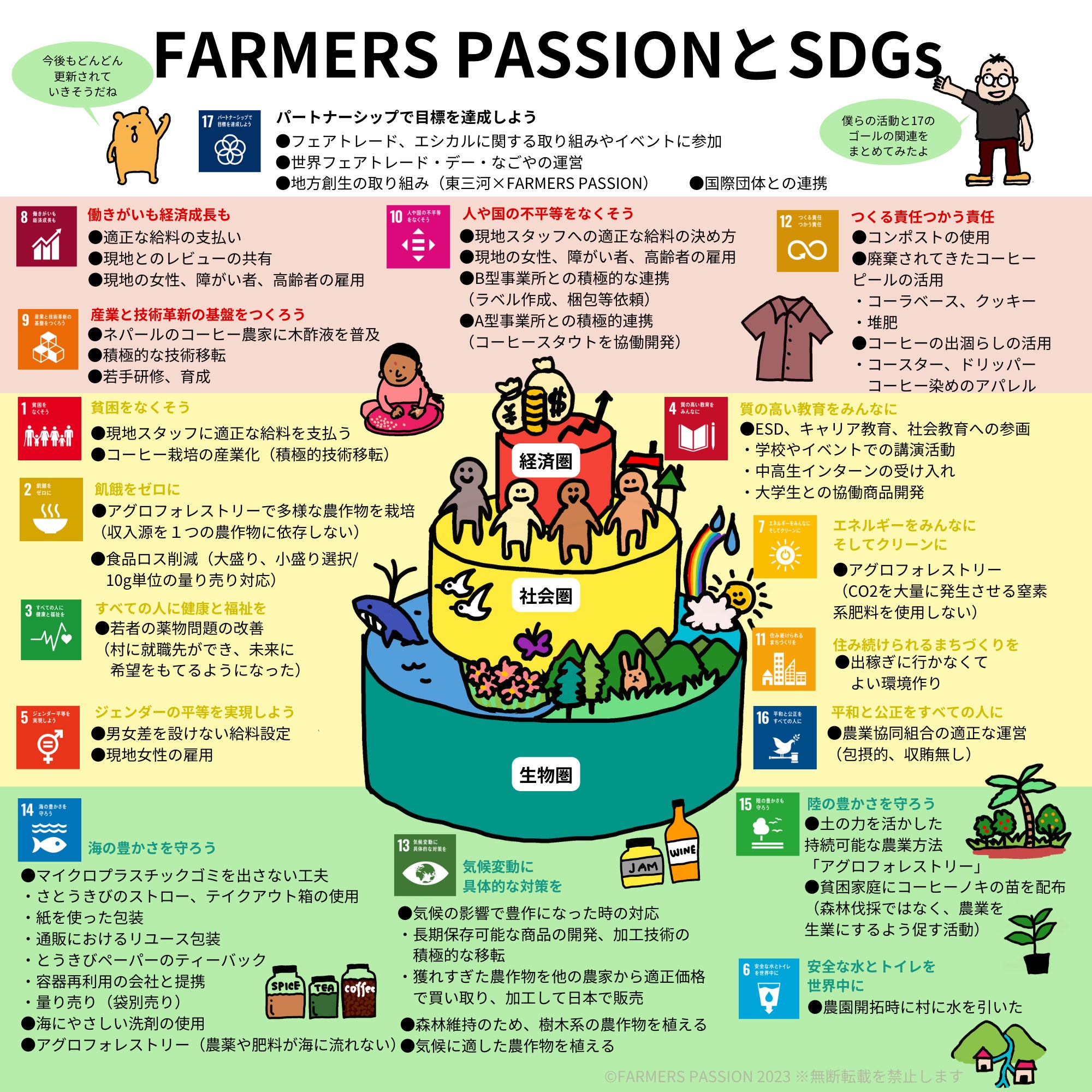 FARMERS PASSIONは、SDGsが採択されるずっと前から、持続可能な社会を維持するため、様々な活動を行ってきました。SDGsの目標との関連をまとめたのが以下のイラストマップになります。(※ヨハン・ロックストローム博士「SDGsのウェディングケーキモデル」に落とし込んでいます。)