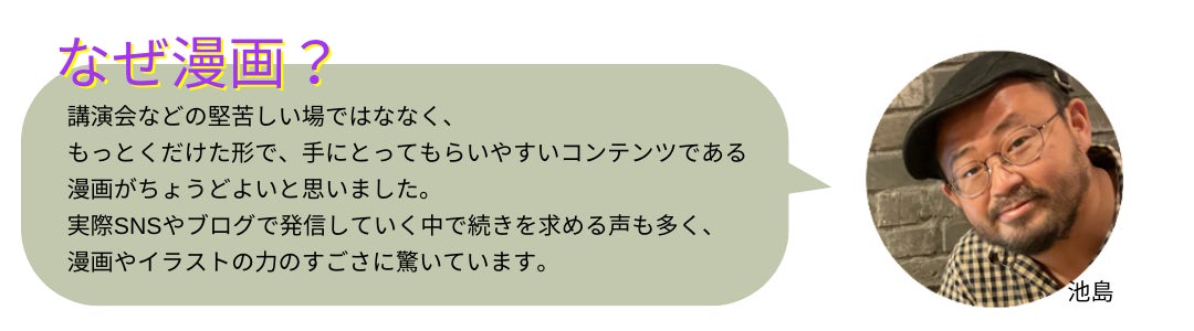 池島さんとクマのモル君の掛け合いによって、ストーリーが展開していく連載型4コマ漫画です。インスタグラムにて不定期連載をしていたものを冊子にまとめることを目指しています。漫画は、老若男女誰にとってもとっつきやすく、より多くの方に内容を知ってもらうツールの一つです。20cm×20cmの正方形の冊子で発行します。
