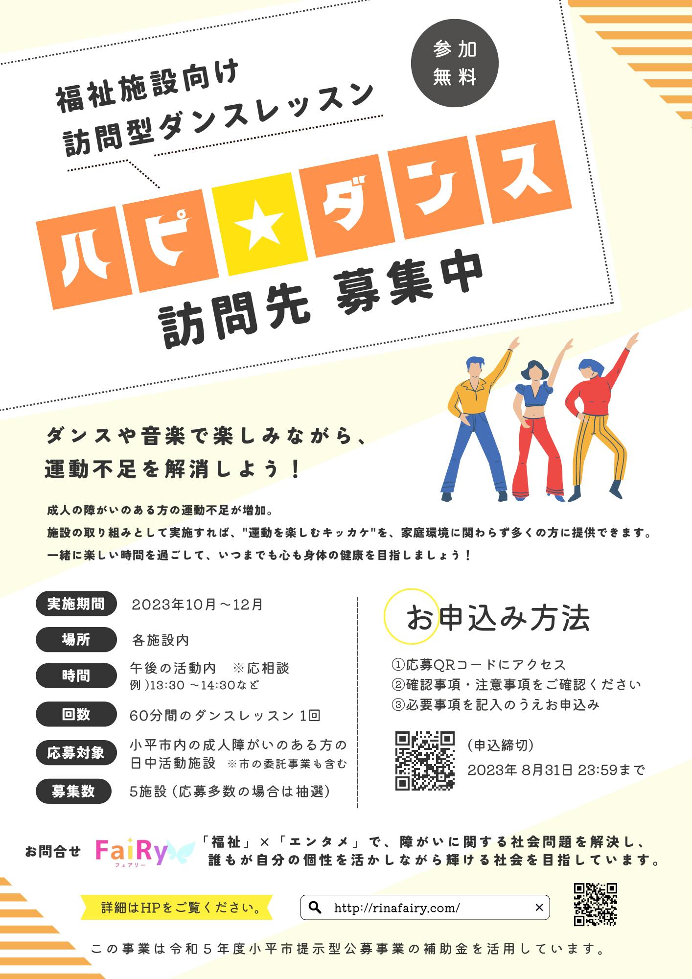 障がいのある方の運動不足を楽しく解消するための、福祉施設向け訪問型ダンスレッスンも行っております。