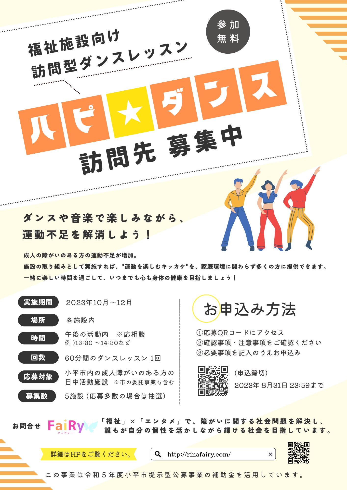 今回のプロジェクトには書いておりませんが、障がいのある方の運動不足を楽しく解消するための、福祉施設向け訪問型ダンスレッスンも行っております。障がい者就労継続支援B型・障がい者生活介護施設・放課後デイサービス・障がい児者支援団体などに導入中、初めて小平市から補助金をいただきました。(トップ画像はその時のチラシです。)「ダンスをしたくても習える環境がないので有難い」「訪問してくれることがとても良かった」「想像以上に利用者の積極性が見られた」などとてもご好評をいただいており、訪問先も増えております。例えば、FaiRyのダンスレッスンや運動場に付き添えるが家族はいいですが、ご家庭の状況により「送迎や付き添いが難しい」という方も多くいます。そこで、講師が福祉施設に訪問することで、家庭環境に関わらず、より多くの方にダンスとして運動を定着させ、楽しむキッカケを与えられると考えました。ですが、こちらにも問題があります。有難いことにレッスン料をいただいておりますが、福祉とエンタメの料金設定が釣り合うことは難しいのです。現在、私は1レッスンにつき約10人〜30人障がいのある方に1人でダンスを教えています。叩かれたり、腕や服を掴まれたり、大声で叫ぶ方や、いきなり頬にキスされたこともあります。レッスン内容も、その日の利用者さん達の状況により、その場で変えていく必要があります。講師自身が、自分で臨機応変に動かなければなりません。それらに臨機応変に対応しながら、専門分野であるダンスを教える講師の活躍には、しっかりと報酬を支払うべきだと思っています。また、訪問先が増えるほど私一人では限界がきます。他の講師が必要になります。踊りたくても、踊れない人がたくさんいるのに、教えてくれる人がいない・・・教えたくても、報酬が伴わない、ボランティアだと続かない・・・いつまで経っても社会問題は解決されないのです。この現状を改善したい。助成金だと制約があり、地域や数カ所の施設にしか貢献できないでしょう。社会を変えるためには、協力してくださる企業様のご協力が必要なのです。・講師を育成できる=全国各地の福祉施設への訪問が可能になる・講師の活躍に伴った報酬を渡せる=活動が持続し社会問題解決へと近づく・講師を若きダンサーや教える仕事をしたいダンサーに託す=次世代を育成することで、未来の日本や世界から差別や偏見をなくすことができる・より多くの障がいのある方達が、ダンスや音楽を楽しめて心も身体もより豊かになる=病院に行く機会が減ったり、地域や経済活動などへの積極的な社会参加を後押しできる など今回のプロジェクトでも訪問レッスンでも、福祉=安い=ボランティア という概念をなくす。大きなソーシャルインパクトを残すことが出来たら、この世の中が少しづつ変わっていくかも知れません。こちらの活動にもご興味のある方や企業様をご紹介いただける方は、ぜひご連絡ください!