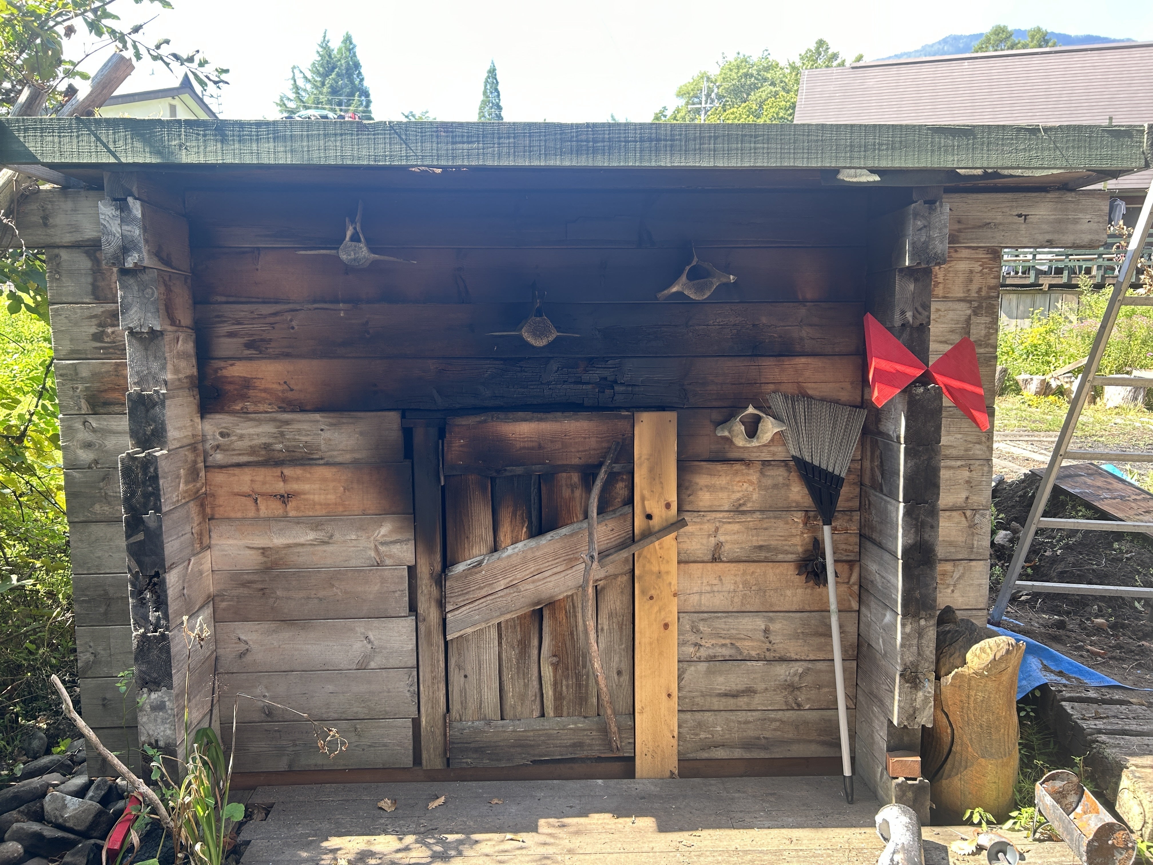 そのほかにもこの小屋の扉の周りにはクジラの頸椎が飾られています。何かのおまじない?と思われた方、正解です。古民家の囲炉裏の鍋の上には魚の飾り物がありますよね。あれは、火が上にいかないように、というお守りとして水棲の生き物を飾っているようです。それにならって、うちはクジラの骨だ!と、なぜか持っていたミンククジラの頸椎を飾っているのです。