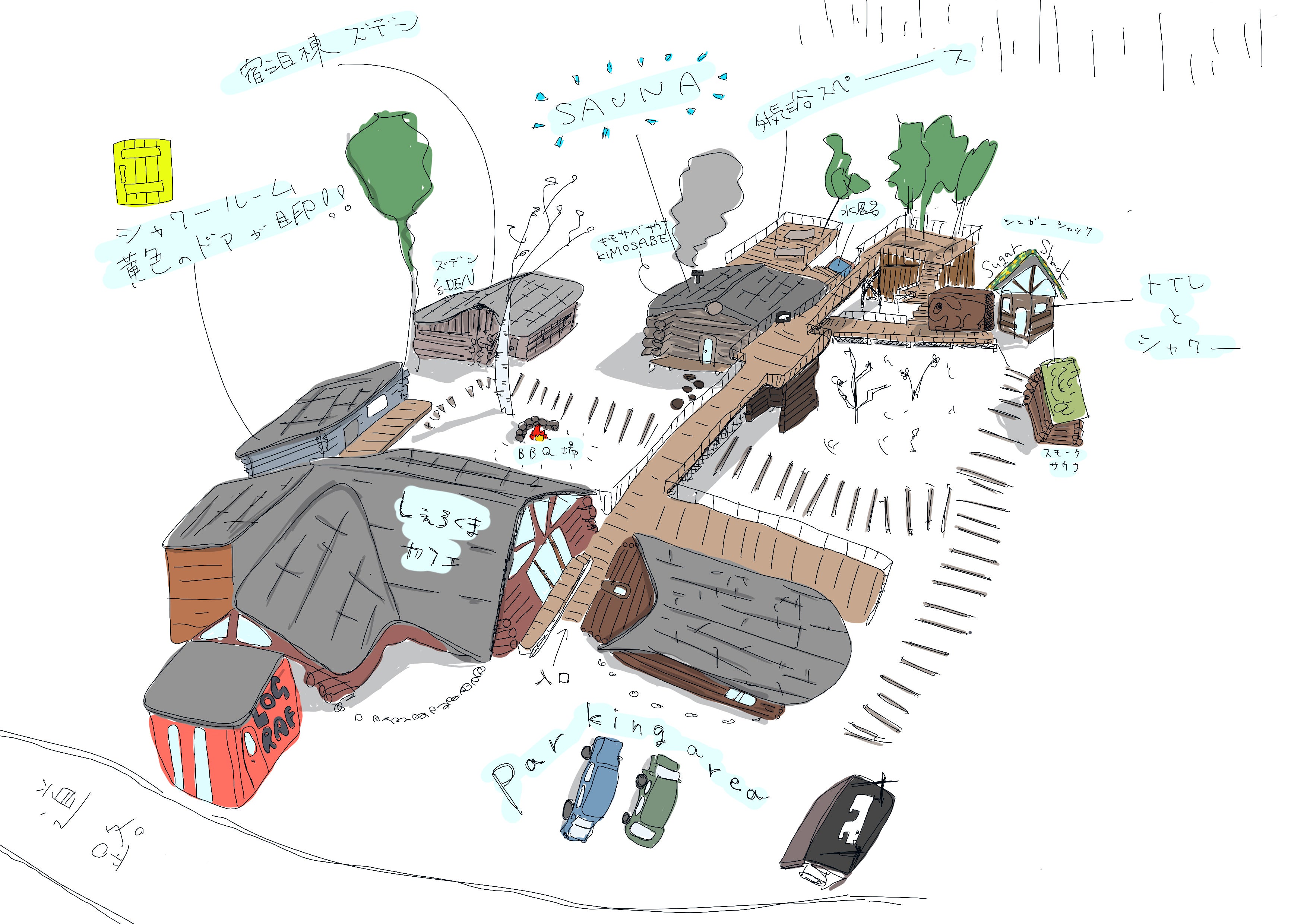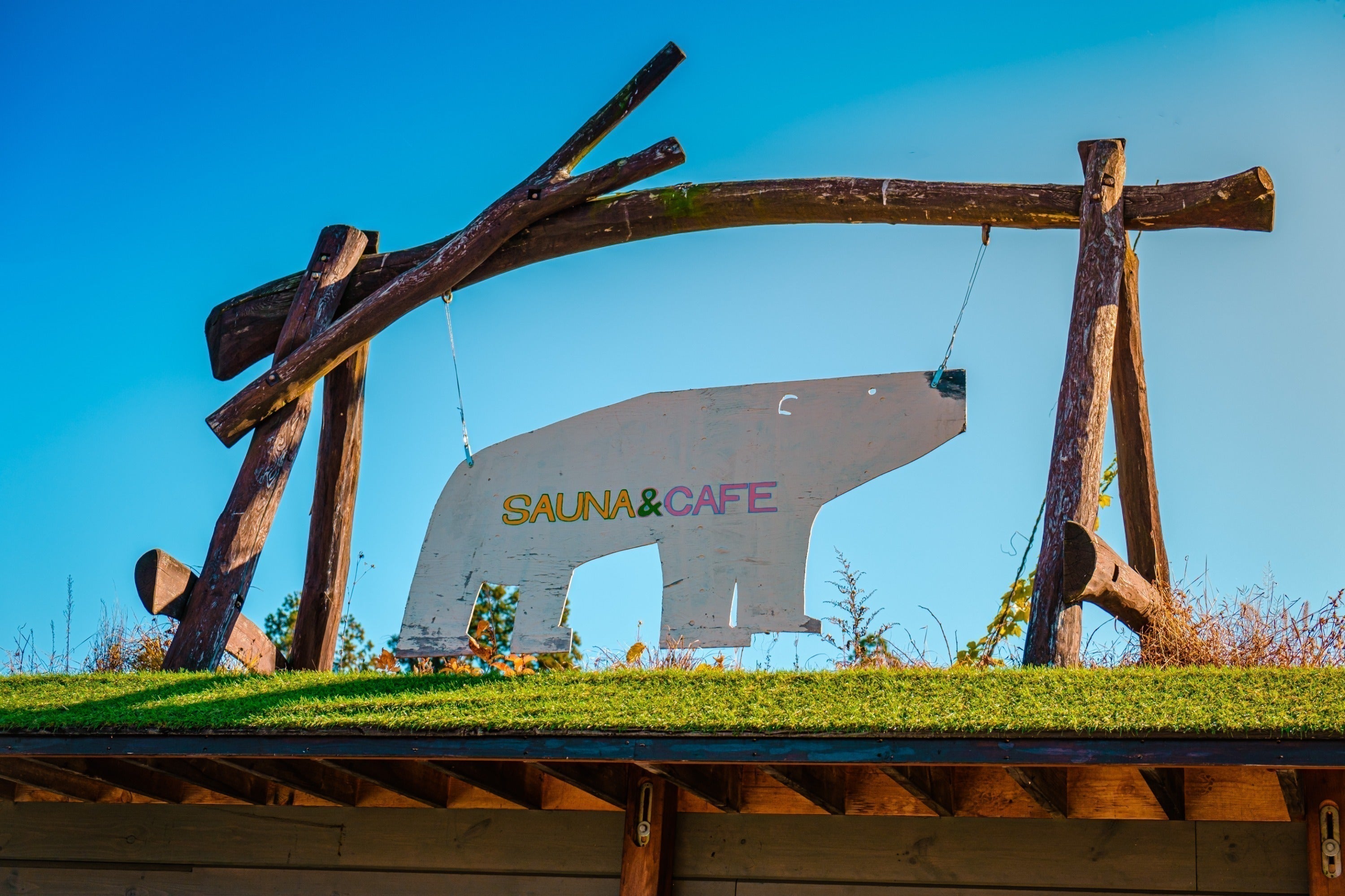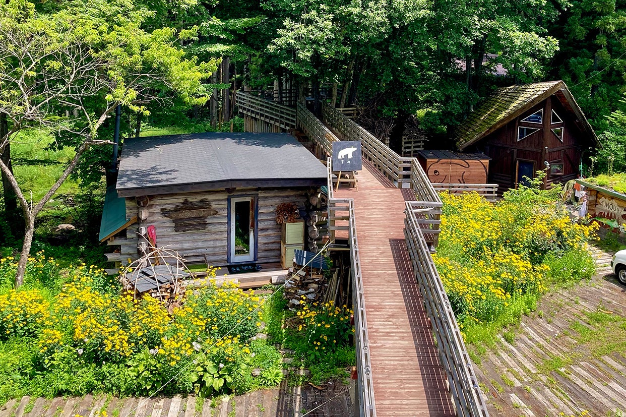 施設全体の施工は長年ログハウスを手掛けてきた株式会社ログラフが担当しています。このしぇろくまサウナはもともと自宅兼事務所であり、ログハウスが敷地内に増殖し、ログハウス群となりました。カフェの建物が一番古く、築35年です。運営を行う株式会社ログスペックは妻である松田美津子が代表。娘である店長のCHIKAはニュージーランドとアリゾナにてアートを学んできた立体造形(スカルプチャー)を制作するアーティストでもあります。サウナ愛を生きるスタッフのYUUNAを4月に迎え、ウィスキングなどのサービスや接客も日々アップデートされています。そんな人々の家族や友人たちとの生活の場でもある為、コツコツと、花を植え、絵を描き、オブジェを作り、橋やテラスを作り、小屋ができ、サウナをつくる、という日々の中から世界観が創られてきました。