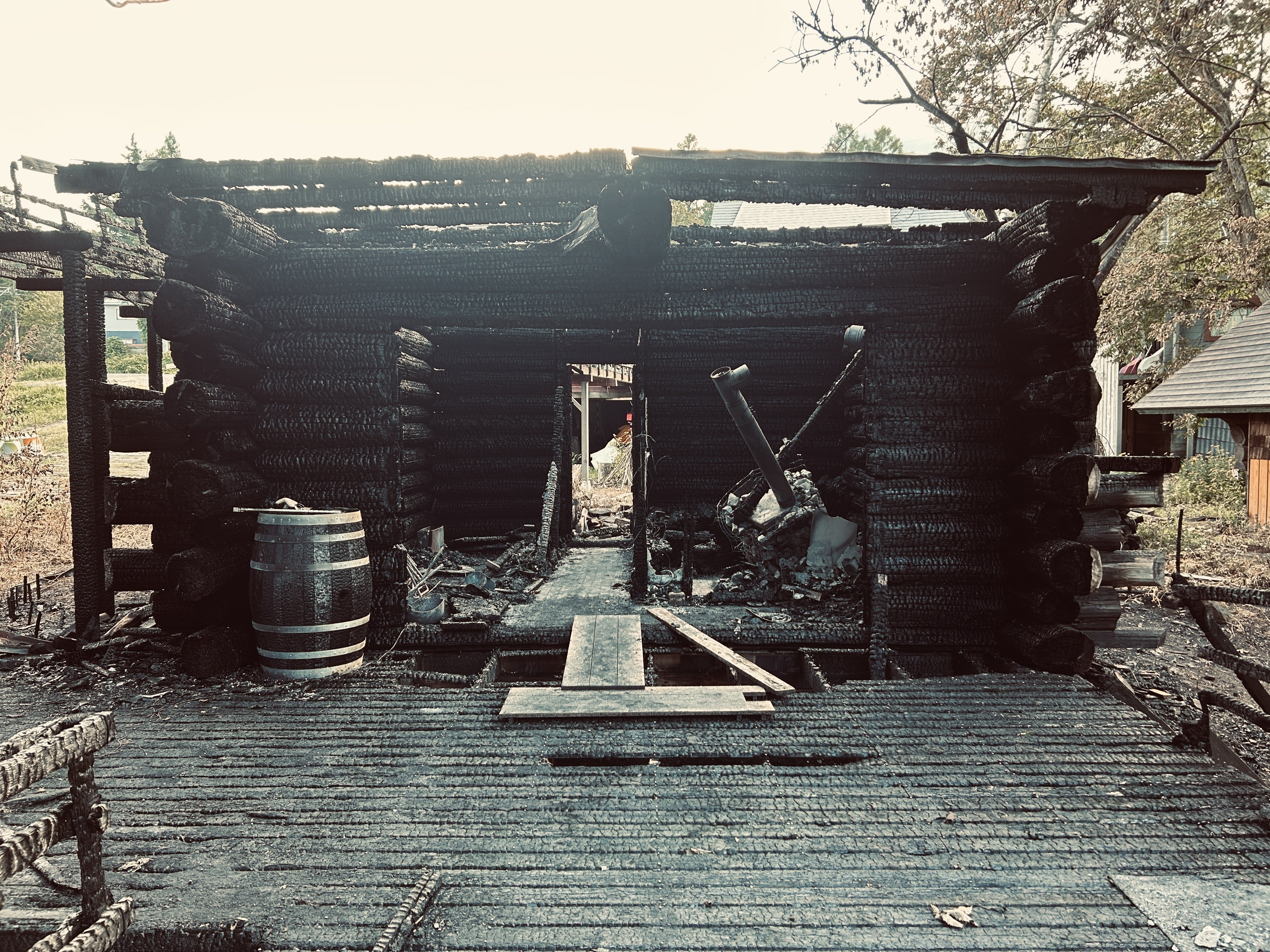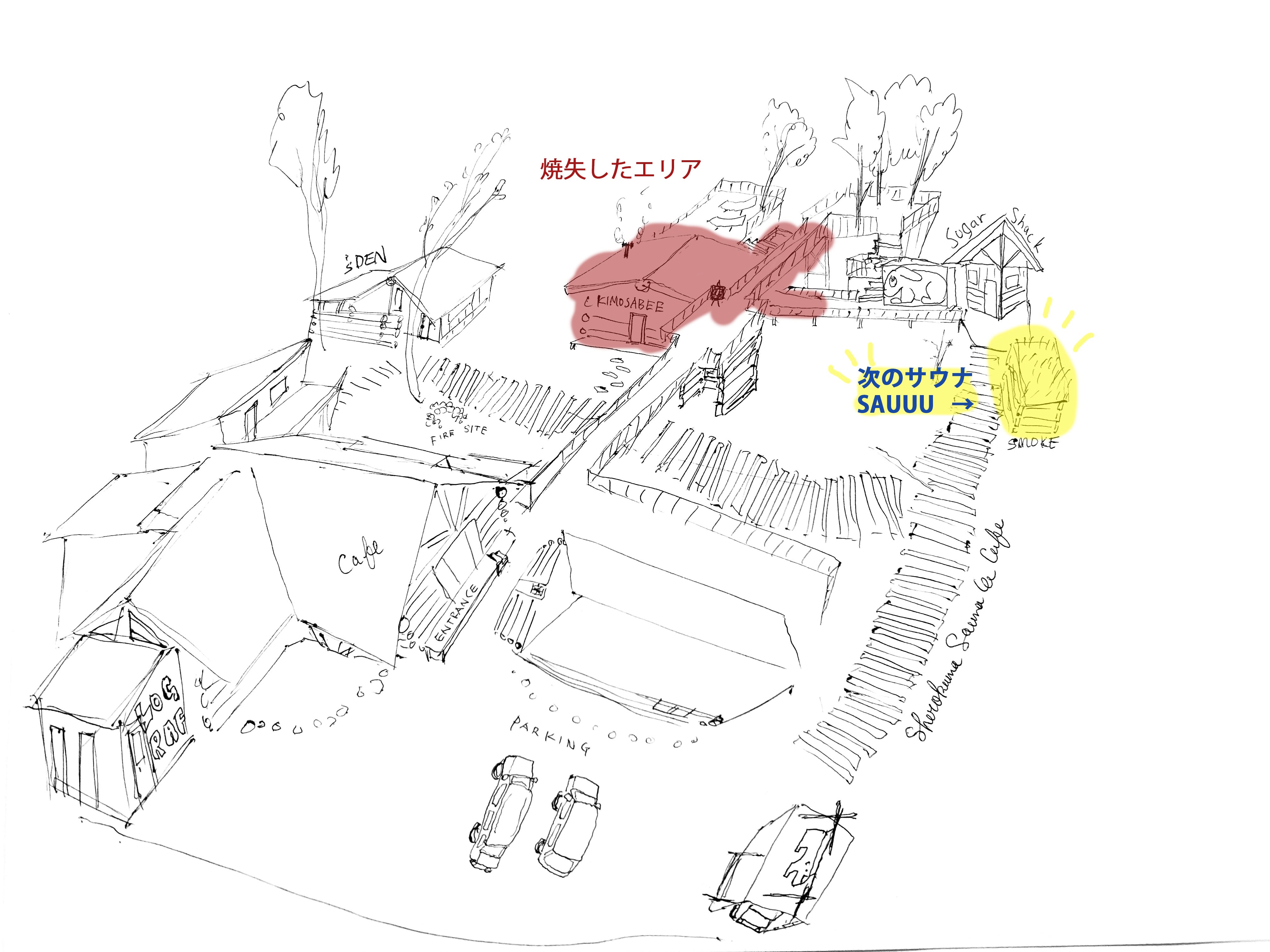 ところが、2023.8.17の火災によりサウナ棟 キモサベ は全焼してしまいました。火元の原因となったのはサウナ室内で灯りとりとして使用していたキャンドルだと推測されています。お客様・スタッフ全員に怪我がなかったことが不幸中の幸いです。しかし、私たちにとっては キモサベ が、サウナを通してたくさんの方と繋がれる場所であり、かけがえのない、とても大切な場所となっていました。ご利用いただいたお客様の中にも、思い出の場所であった方は少なからずいらっしゃると思います。このサウナを失った悲しみは計り知れません。
