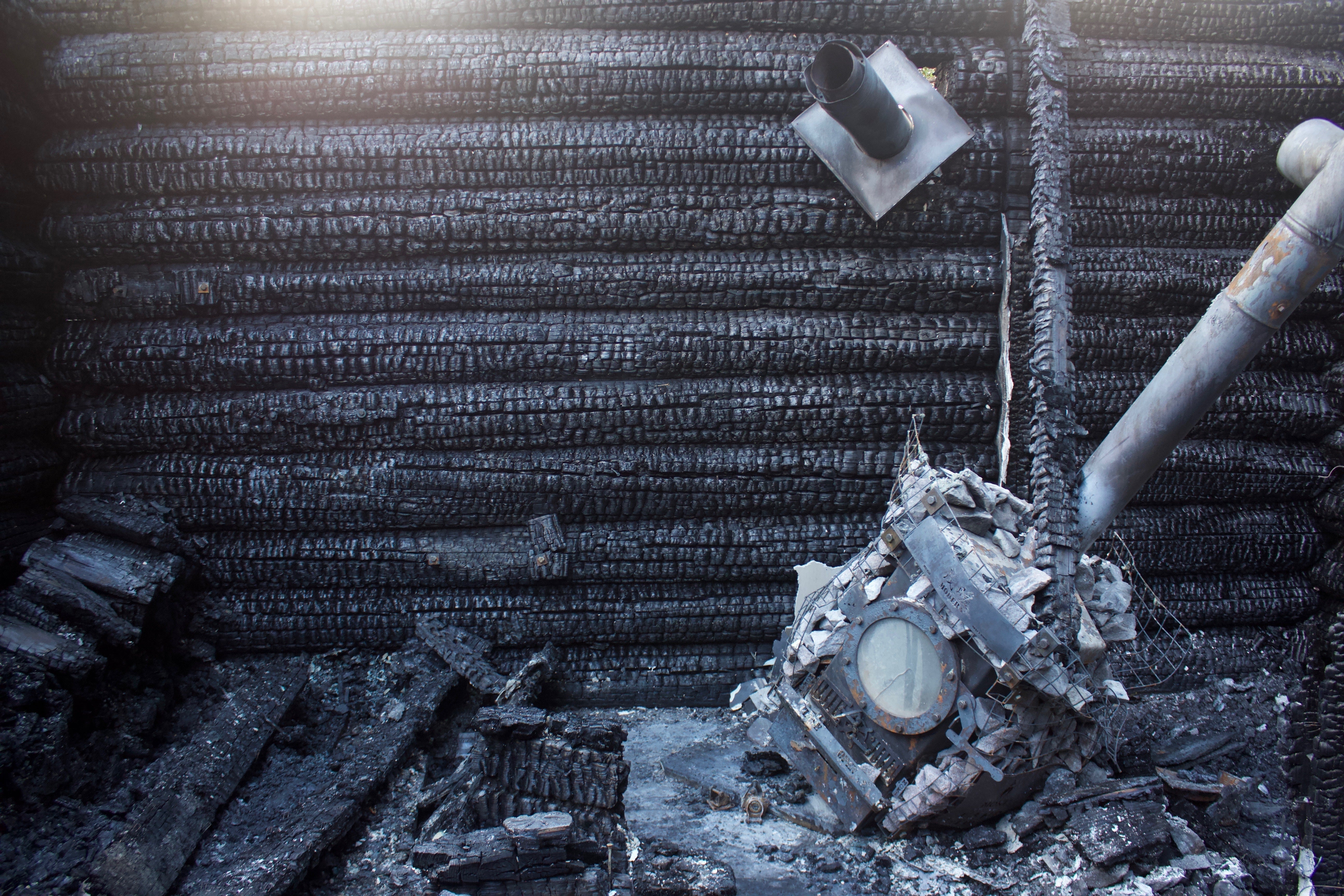 火災後、サウナに刻まれた文字が黒く浮き立っていました。"KIMOSABEE" とは "信頼のおける友人" というアメリカン・インディアンの語。気を許せる仲間たちとの楽しい時間を過ごせる場になって欲しいという想いを込めてつけられたものです。火災が起こる前までは、言葉の通りの場となっていました。