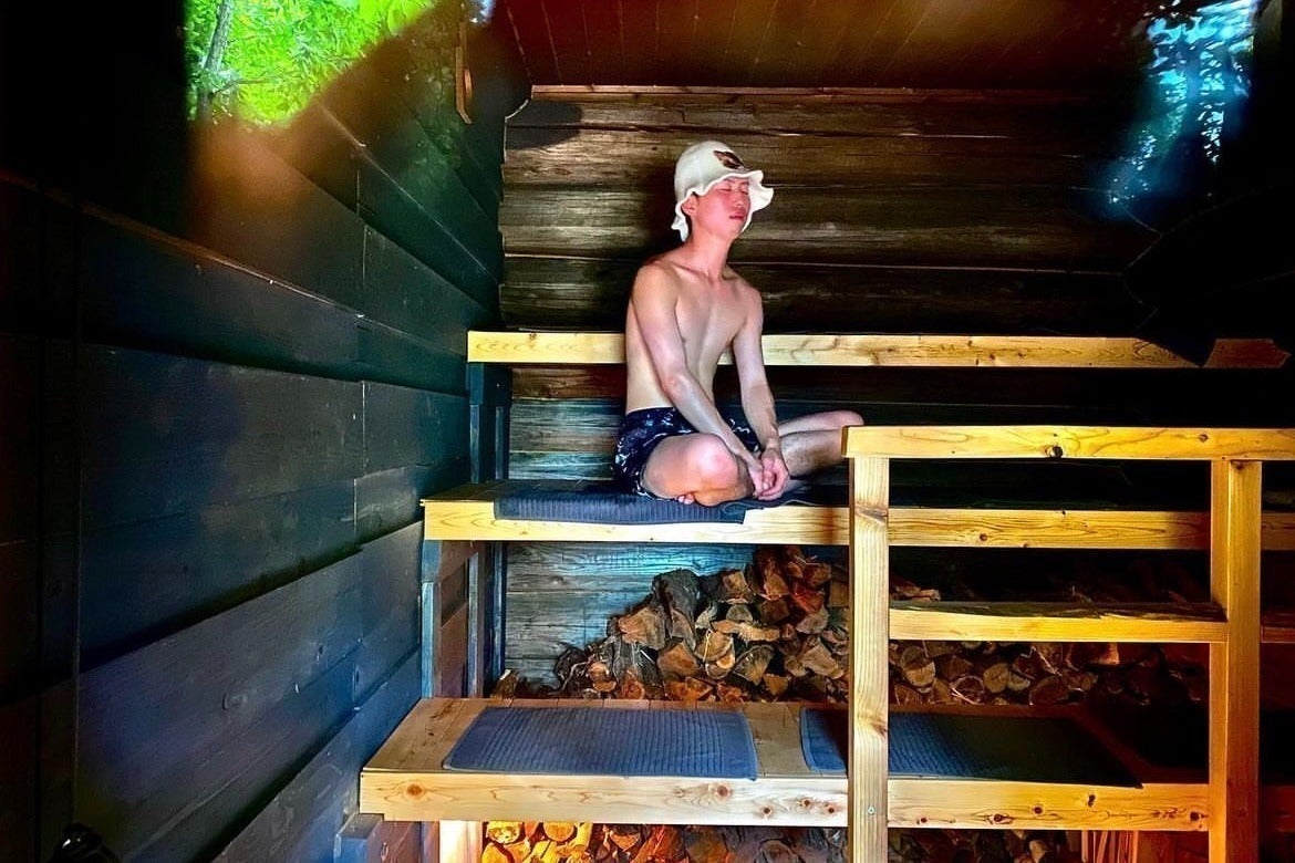 植物たちの生命力が高まる春から夏にかけては地元の白樺を束ねたヴィヒタや、庭に生えているハーブ(ミント、タイム、ラベンダー、クロモジ、などなど)沢山の植物を使ったロウリュ やウィスキング。スタッフやお客さんのアイディアを取り入れたサウナ室や外気浴中の過ごし方を日々楽しんでいました。そして秋の紅葉シーズン。サウナ室で温めておいた落ち葉に埋もれる”ミノ蒸し”サービスもありました。冬はもちろん雪ダイブです。春先も水風呂はシングルを楽しめます。梅雨時期は雨音を聴きながら、幻想的な霧サウナ。視覚に触覚に聴覚に嗅覚に、繊細な自然を感じられるアウトドアサウナならではの体験がしぇろくまサウナにありました。