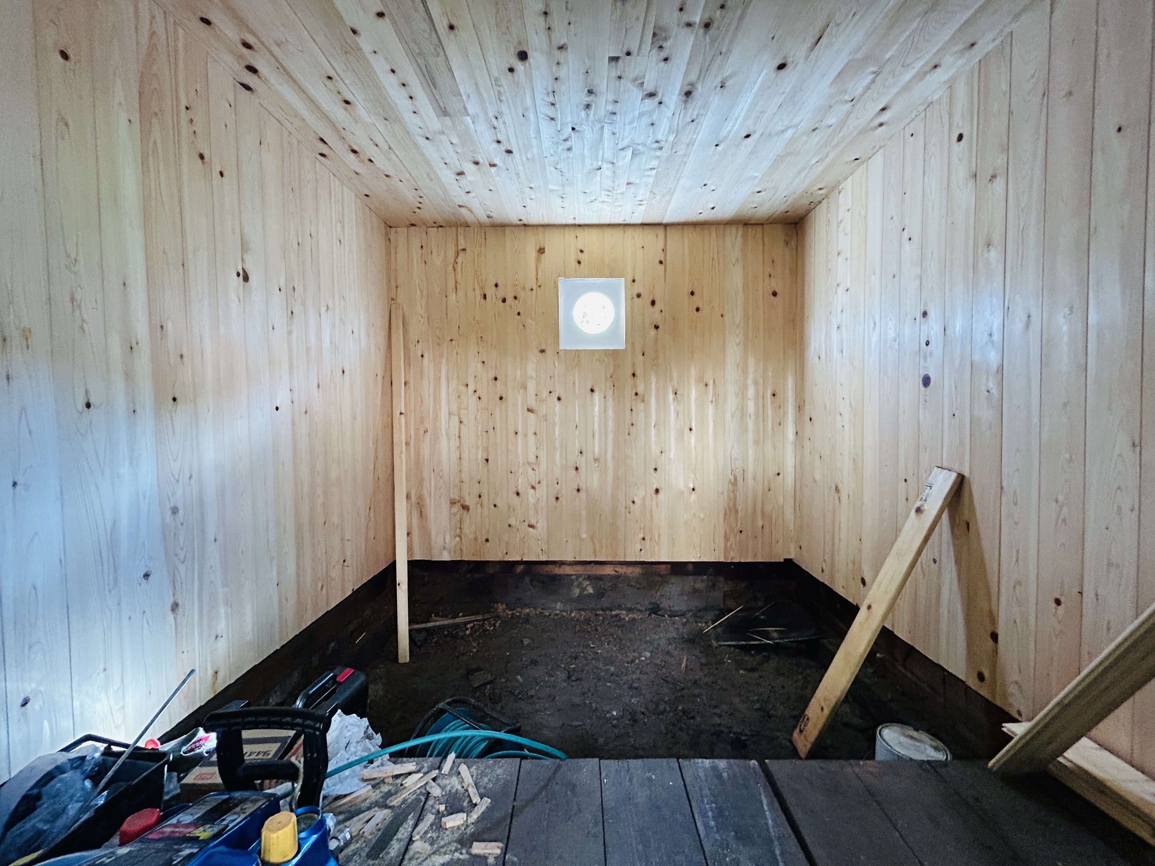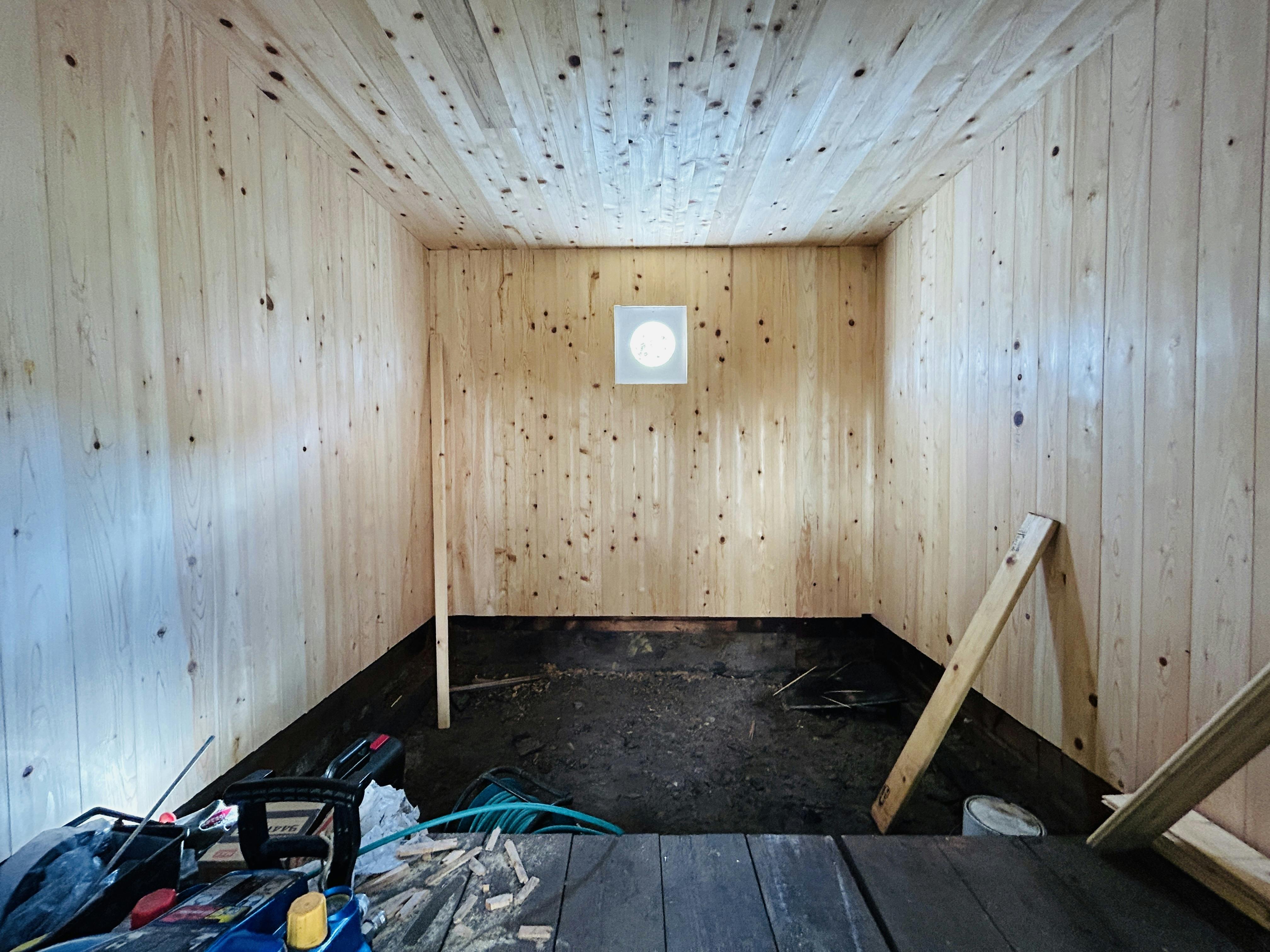 この後、両脇にベンチ、正面にストーブが入ります。ベンチはウィスキングできるように、寝そべりができる幅になる予定です。