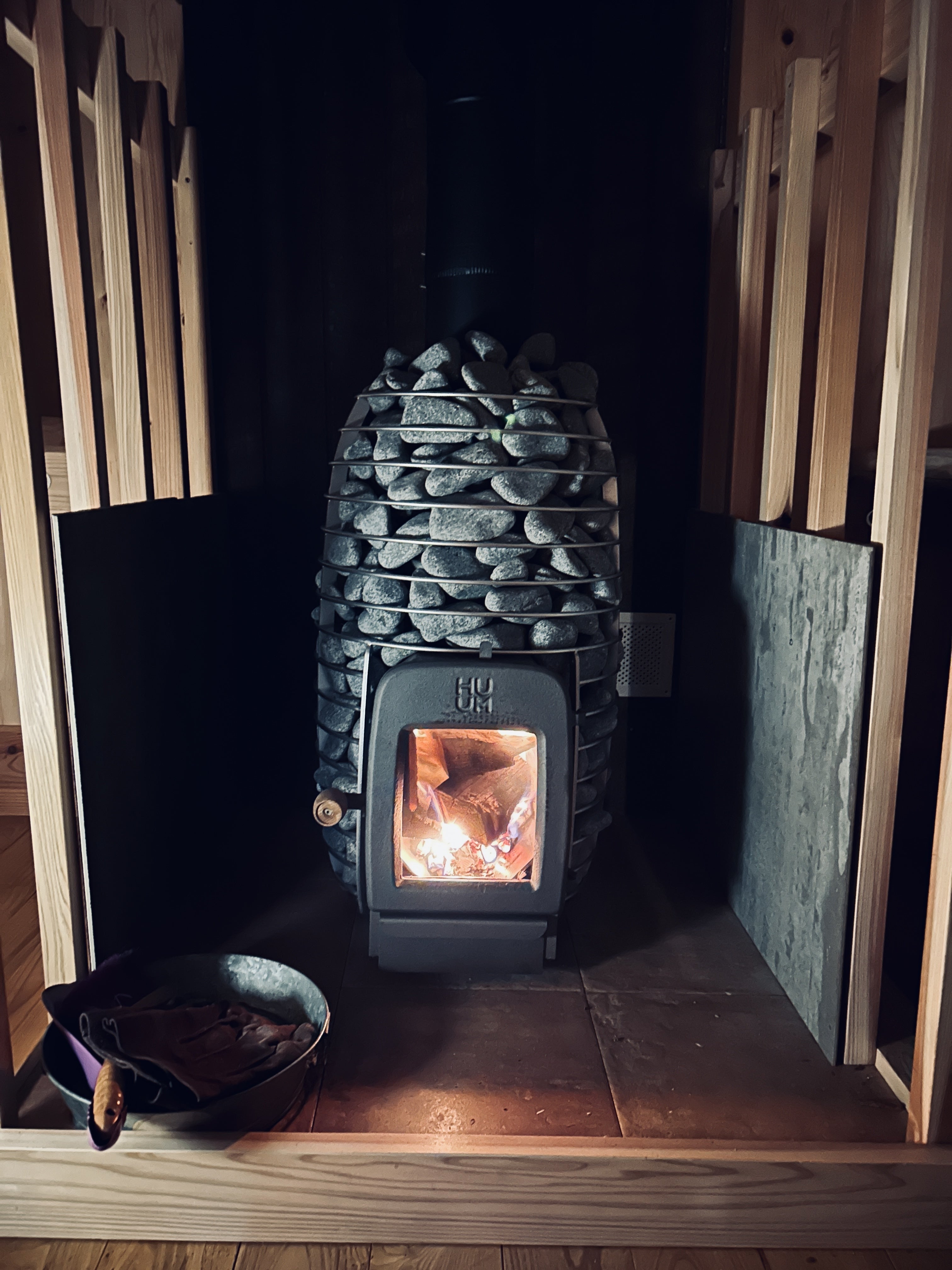 エストニア産のストーブです。雫型のおしゃれなストーブ。サウナストーンも丸く削られており、ロウリュがマイクロミストと呼ばれ、ミストの粒子が細かいらしいです。