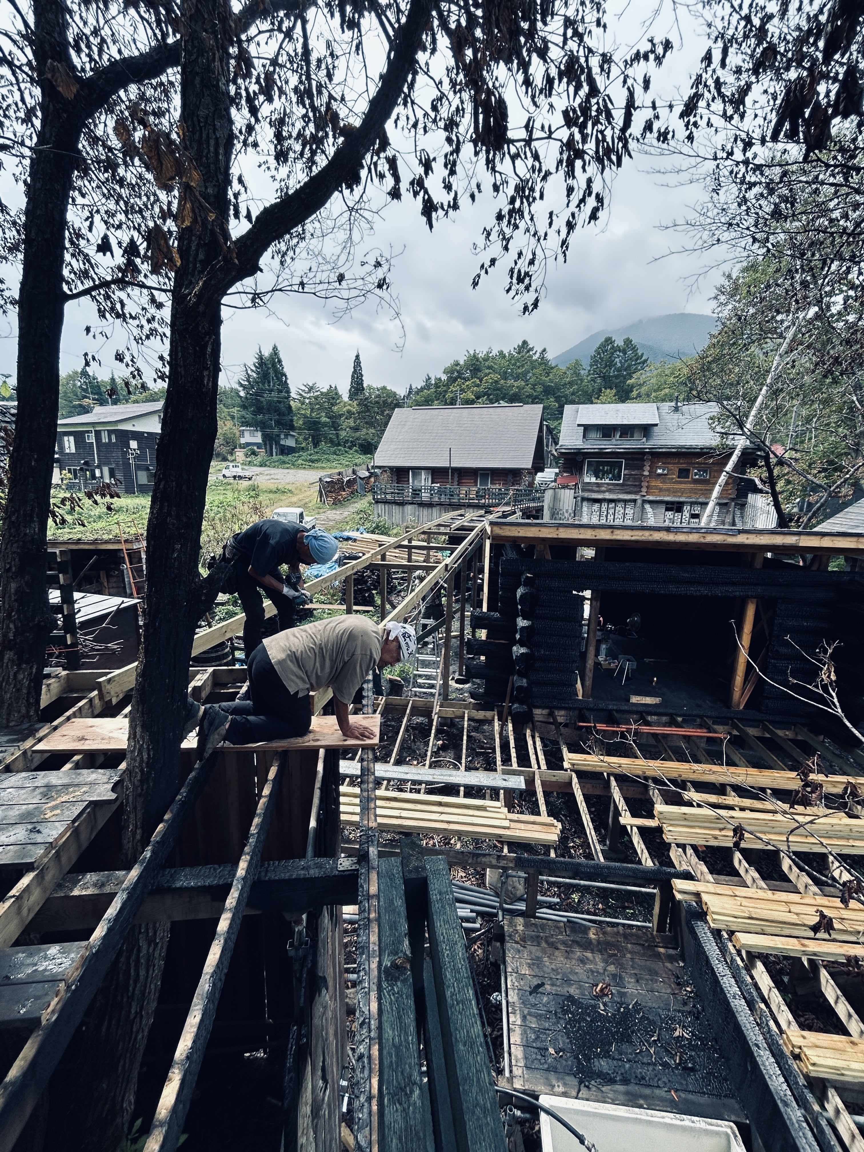 以前と同じように、サウナへの空中回廊も工事が進んでいます。“しぇろくまサウナの世界観”というものの重要な構築物がこの空中回廊だったかな、と思います。この景色の中でお茶するスペースを作りたい、ということで、サウナの営業が始まる何年も前にできた空中回廊。地上3mを歩く楽しさ。サウナに辿り着くまで、期待を高める装置となる重要な回廊。復活しつつあり嬉しいです。橋桁を立て直し、板が貼られていきます。燃えたKIMOSABEE前のデッキも貼り終わりました。着々と傷を癒し、復活する、しぇろくまサウナ。火事のお見舞いに来てくださった方の「スタッフの皆さんの心の火が消えていなくて良かった」という言葉。火災の消火とともに私たちの心の火も消えかけた瞬間もありましたが、本当に多くの方に支えられ、8月17日の火災以降今日まで進んでくることができました。焦げた木が、新しいものと取り替えられていくにつれ、新たな気持ちが芽生えてきます。再開を待っていてくださる皆さんの期待に応えられるよう、頑張ります。