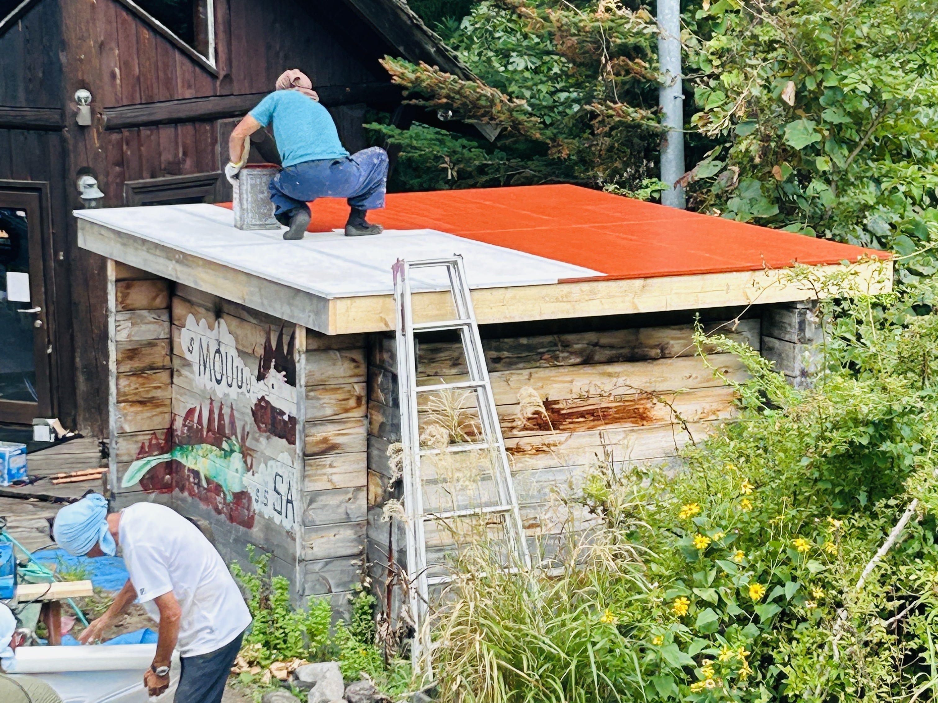 スタートから5日で78%達成、82人の方にご支援いただいております。本当にありがとうございます!!!しぇろくま(サウナ)&カフェにお越しいただく方の中に、現状を見て「逆に元気をもらいました」仰ららる方々がいらっしゃいます。真っ黒な焦げ跡での再建の動きに、希望を見出してくれているようです。それもこれも全部、私たちが一人ではなく、支えてくださる皆さま、お客様の存在があってこそだな、とつくづく感じています。ミニサウナ「SAUUU」の天井を剥がして改装が始まりました。しぇろくまサウナにお越しいただいたことがある皆さまは見かけたことがあるかと思います。トイレ&シャワー棟(砂糖小屋)の目の前にあったスモーク小屋です。リニューアルに向けて天井をやり直し、煤がついた室内壁やベンチも綺麗いにします。ストーブも小屋のサイズに合ったものを、この後入れる予定です。KIMOSABEEに比べてコンパクトになりますが、熱源に近くロウリュが充満しやすくなる予定です。お茶室のような空間になりそうな予感。現在、屋根は仕上がり、煙突を通す眼鏡石の設置まで完了しました!
