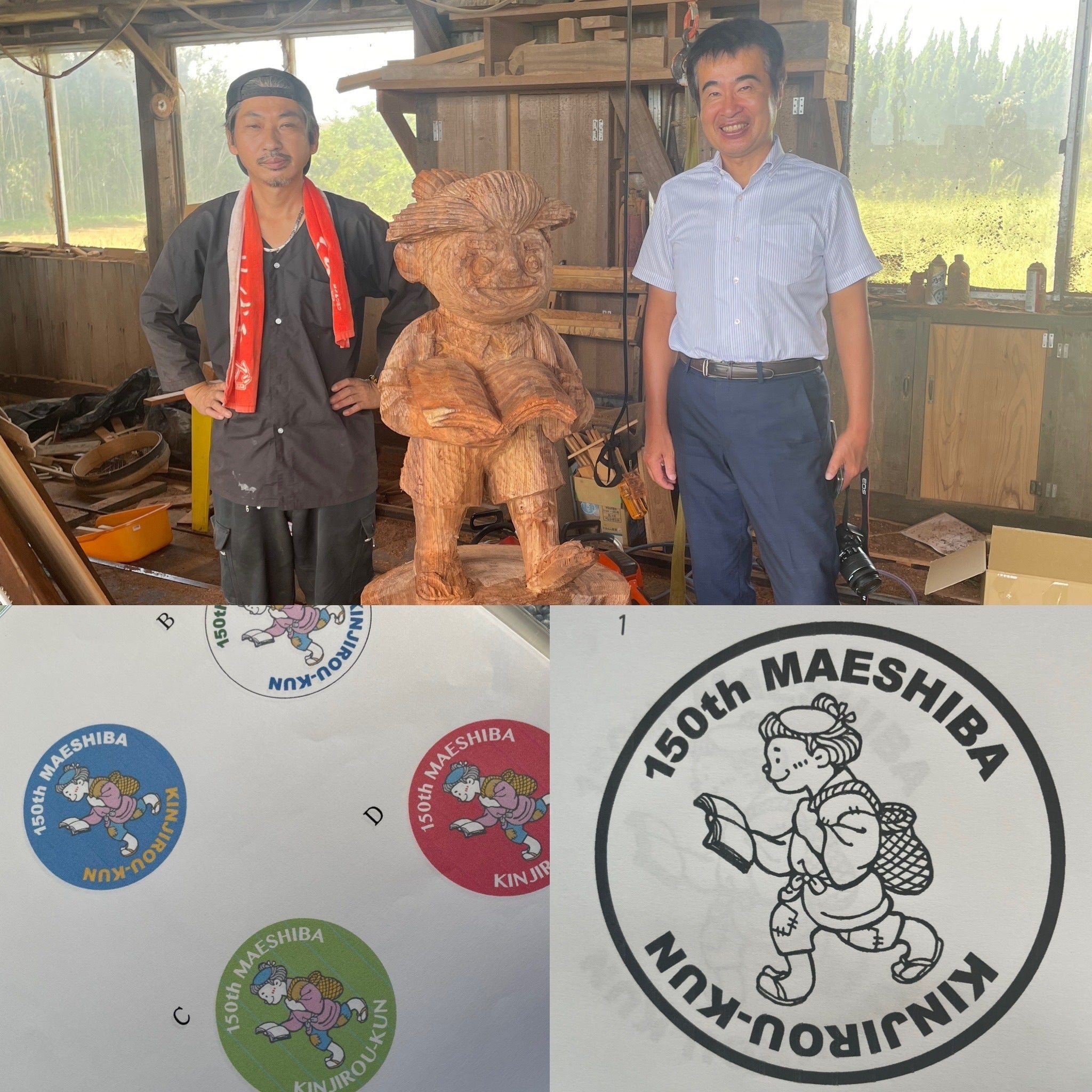 製作後寄付予定の前芝小学校の校長先生が、主人が受けおっている創立150年のチェーンソーアートの金次郎くん像の進み具合を確認がてら、シールシートの袋に貼る前芝オリジナルの魚篭を持った金次郎くんステッカーの打ち合わせもさせて頂き、俄然