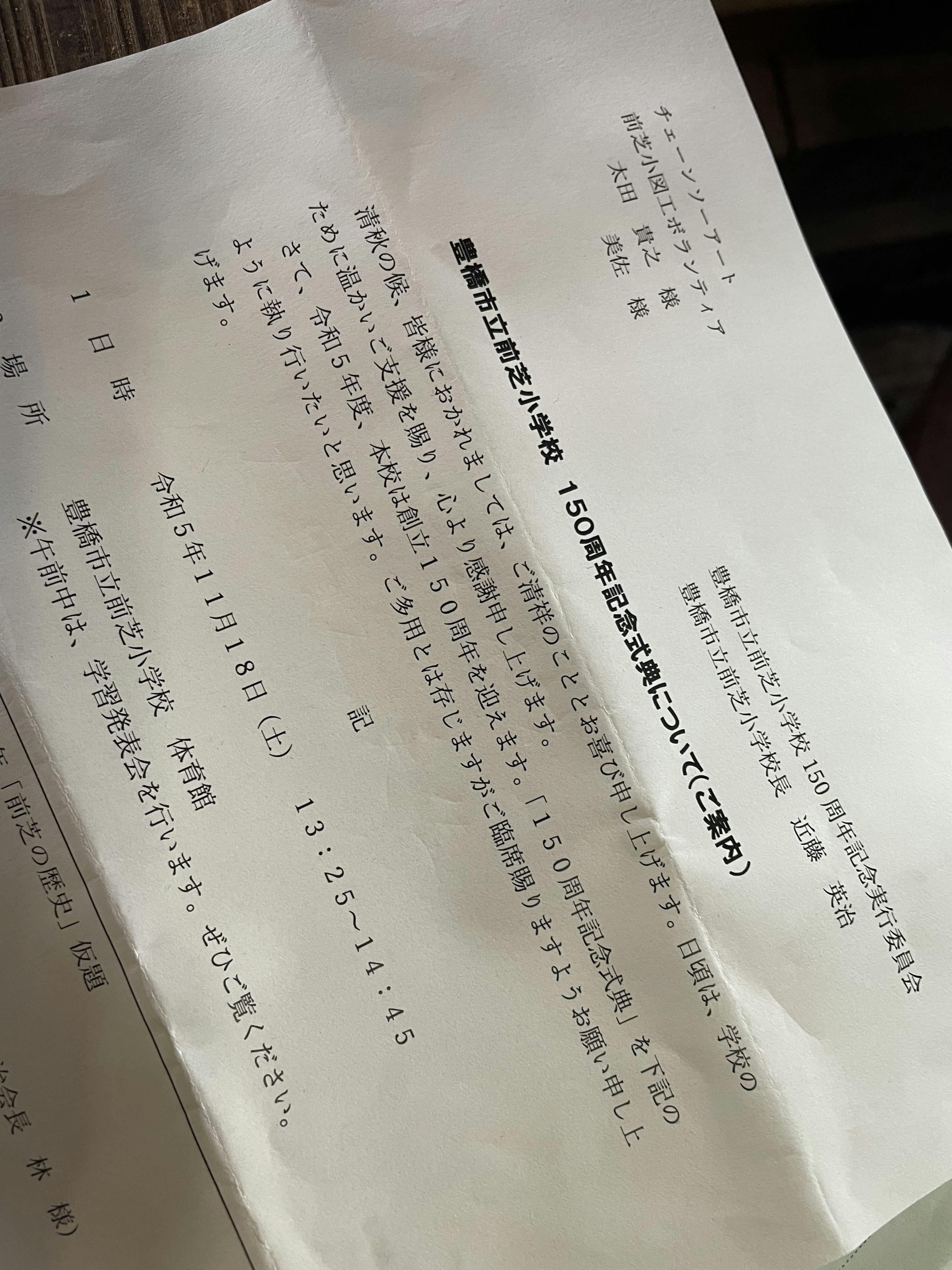夫婦で、前芝小学校150周年の式典に、招待の案内がとどきました〜。