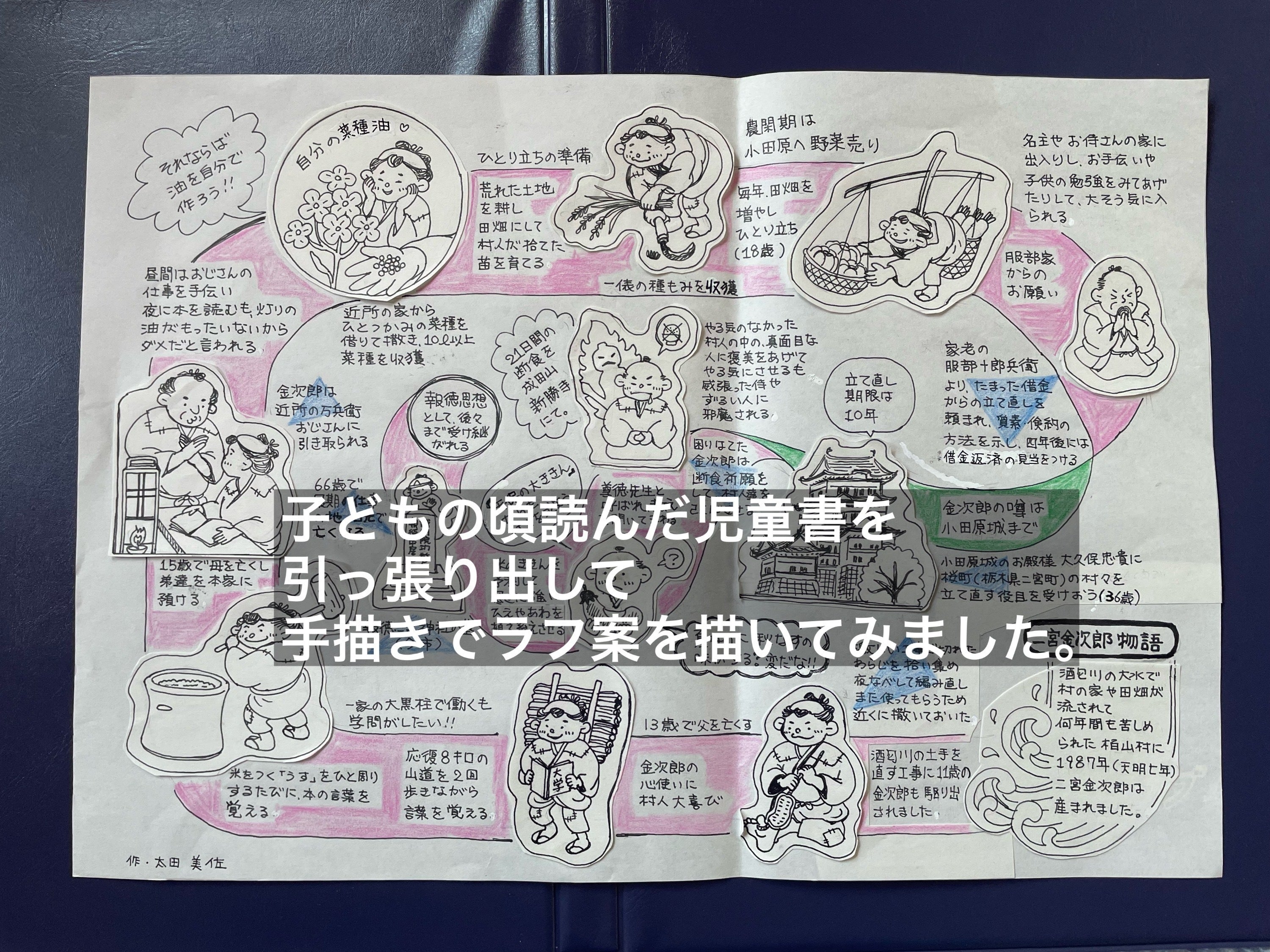 もう一度、子供の頃に読んだ「二宮金次郎物語」を読み返し、内容をまとめ、それを人生ゲームのように物語を文章とイラストでまとめて、それを友人のデザイナーにデジタル版下として印刷所に回せる状態のものを作ってもらってます。