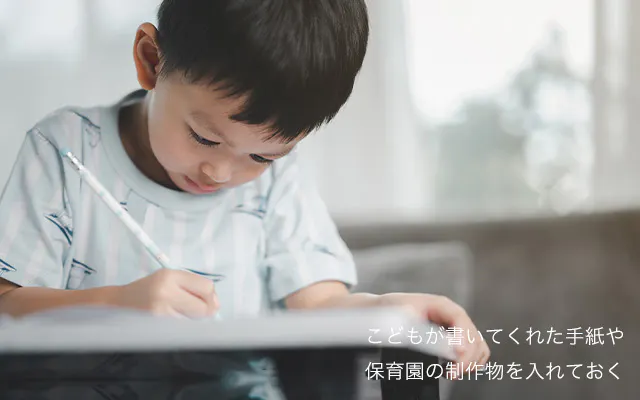 このポケットには、大切な人からもらった手紙や、こどもが描いた絵など、思い出に残る宝物をしまっておくことができます。