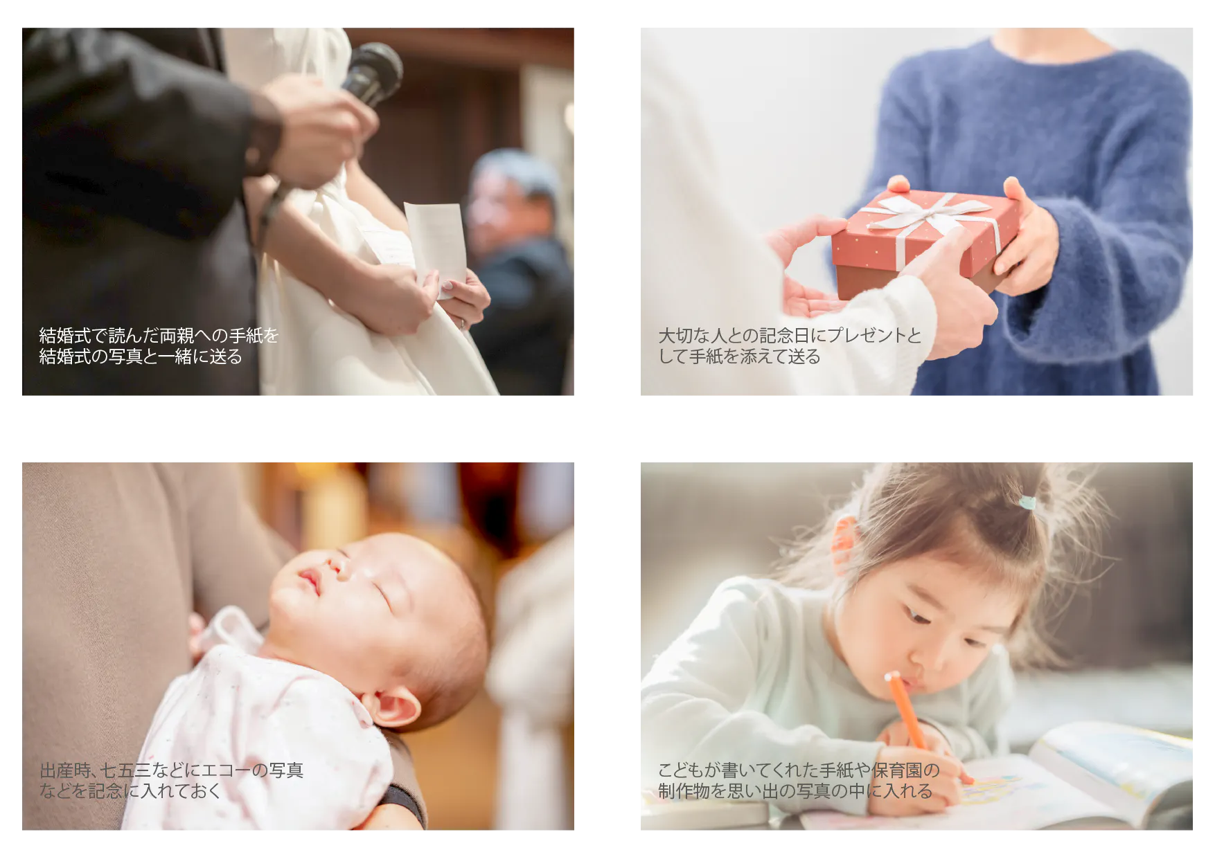 結婚式で、両親に書いた手紙を、自分の小さい頃の家族写真と一緒にプレゼントとして提供したら、どれほど両親が感動するか。