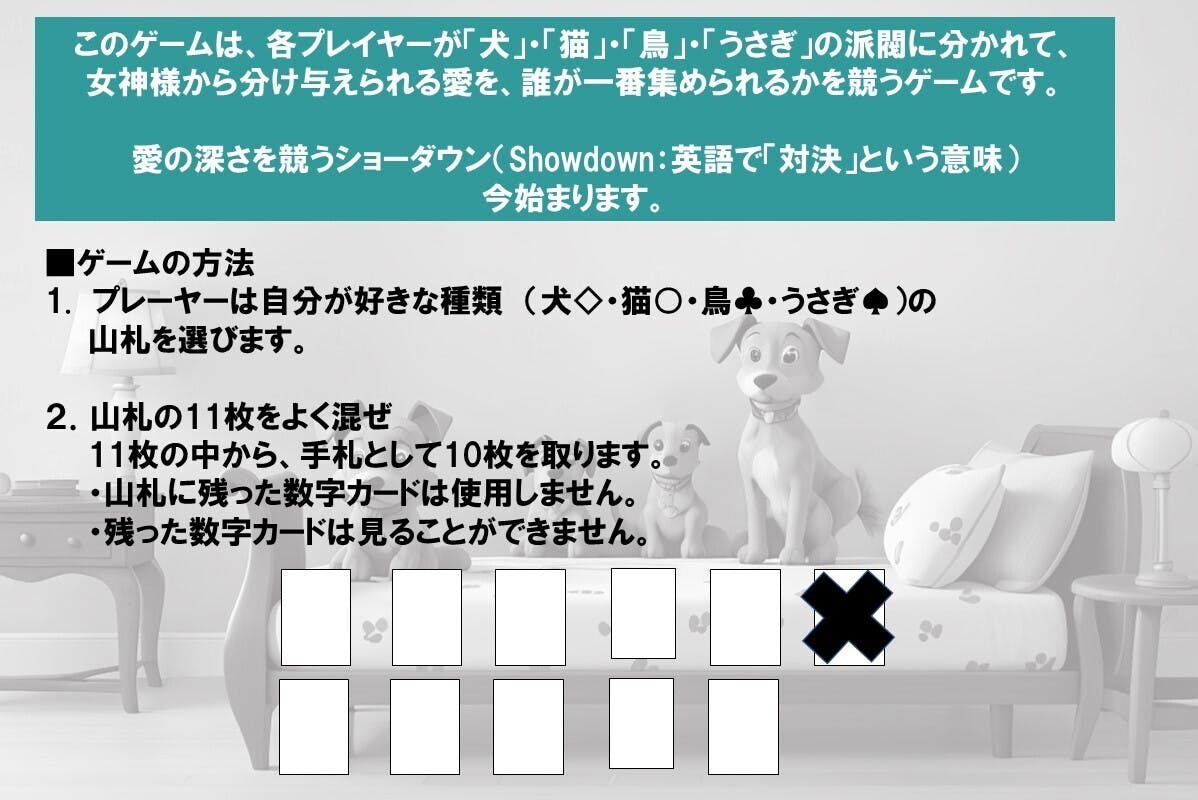 このゲームは、各プレイヤーが「犬」・「猫」・「鳥」・「うさぎ」の派閥に分かれて、女神様から分け与えられる愛を、誰が一番集められるかを競うゲームです。