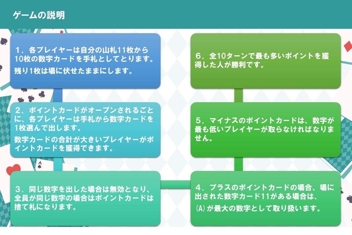 このゲームでは、相手の数字カードの傾向を読みつつ、自分の数字カードとポイントカードの選択を戦略的に組み合わせる必要があります。