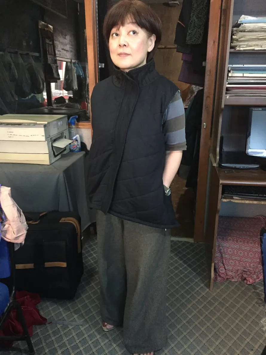 秋冬にぴったりの綿入れのベスト。裏地はシルクサリーでとってもカラフル!表地のコットン生地の色味は黒、レディース11~13号(L~XL)サイズでのワンサイズの仕立てです。