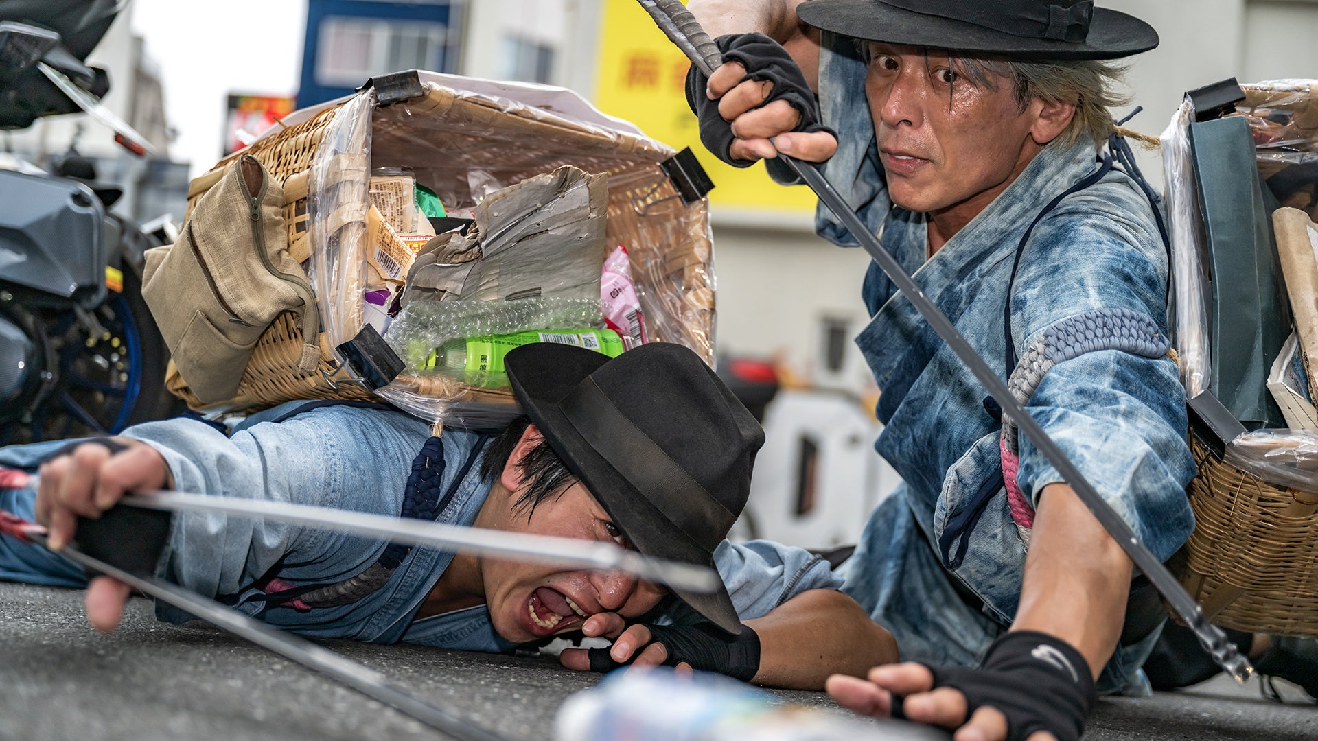 ゴミ拾いカゴを背負い、火ばさみを刀に見立て