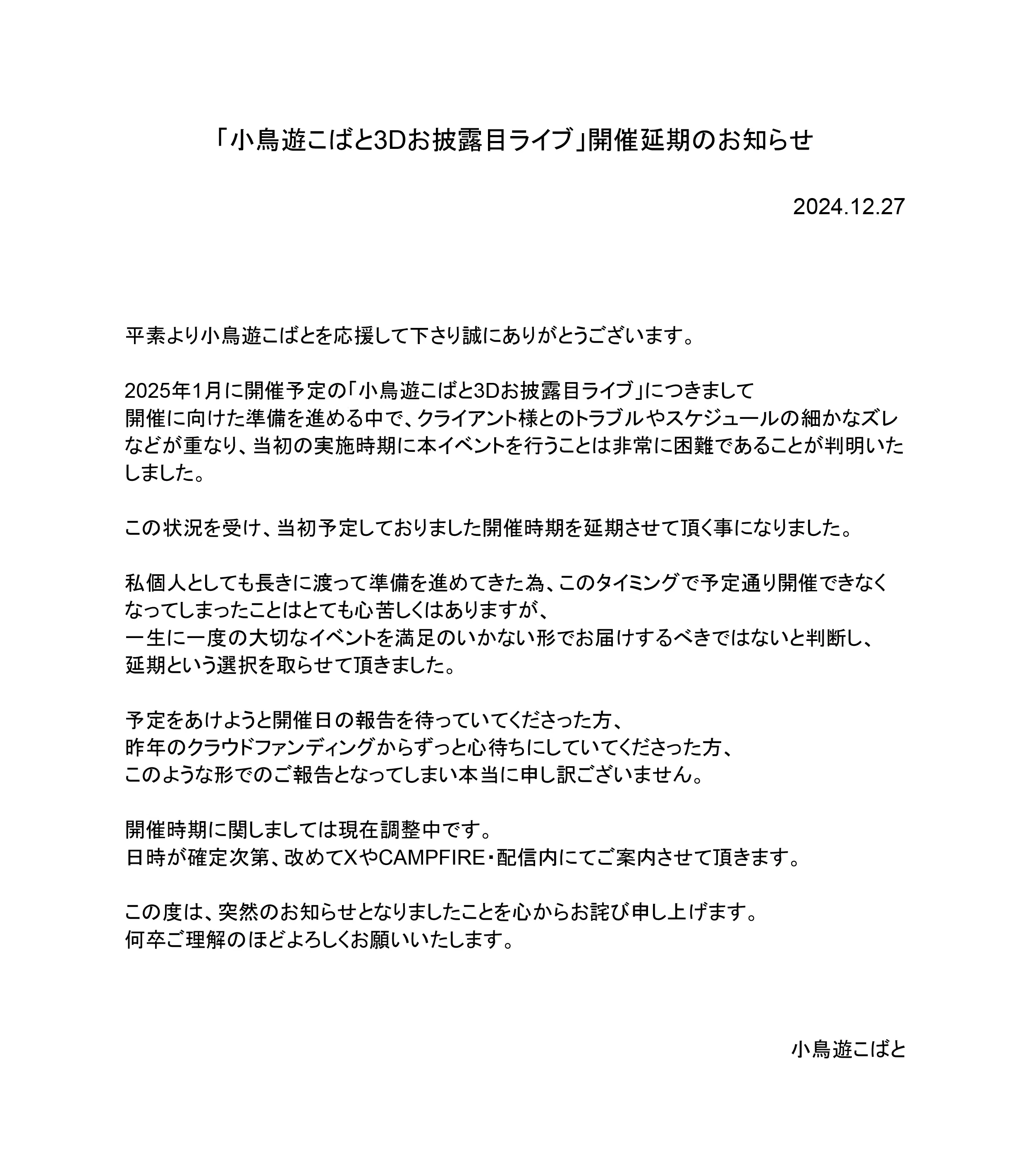 【重要】 「小鳥遊こばと3Dお披露目」 開催時期延期のお知らせ