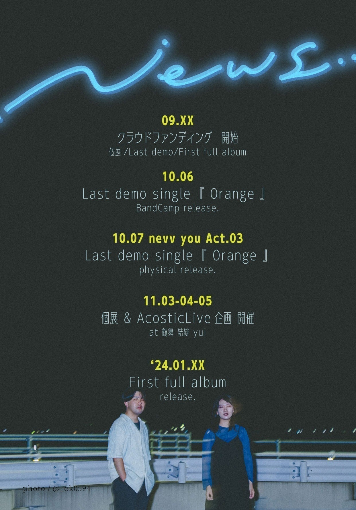 初demo音源から約一年、最後のdemoシリーズとなる「Orange」のリリースと、2024年にFirst full albumのリリース予定。この私たちにとっての大切な現在地点を、いつも応援してくださっている皆様に届けたい、また、まだ私たちのことを知らない方にも知って欲しい。そんな想いで念願の初個展「光の街と、海の物語」を開催いたします。