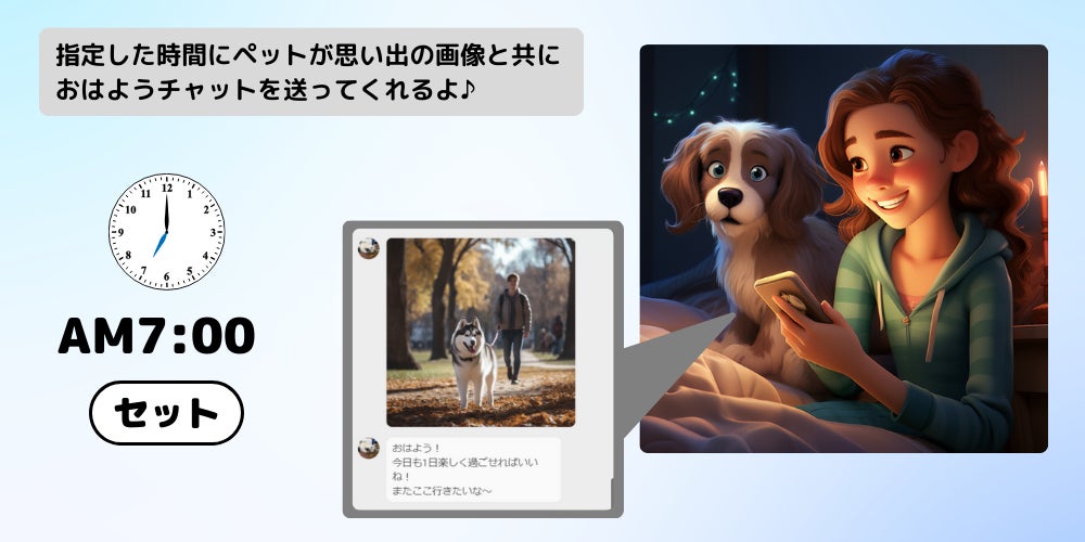 毎日1回、指定した時間帯にペットが思い出の画像と共に挨拶チャットを送ってくれます。