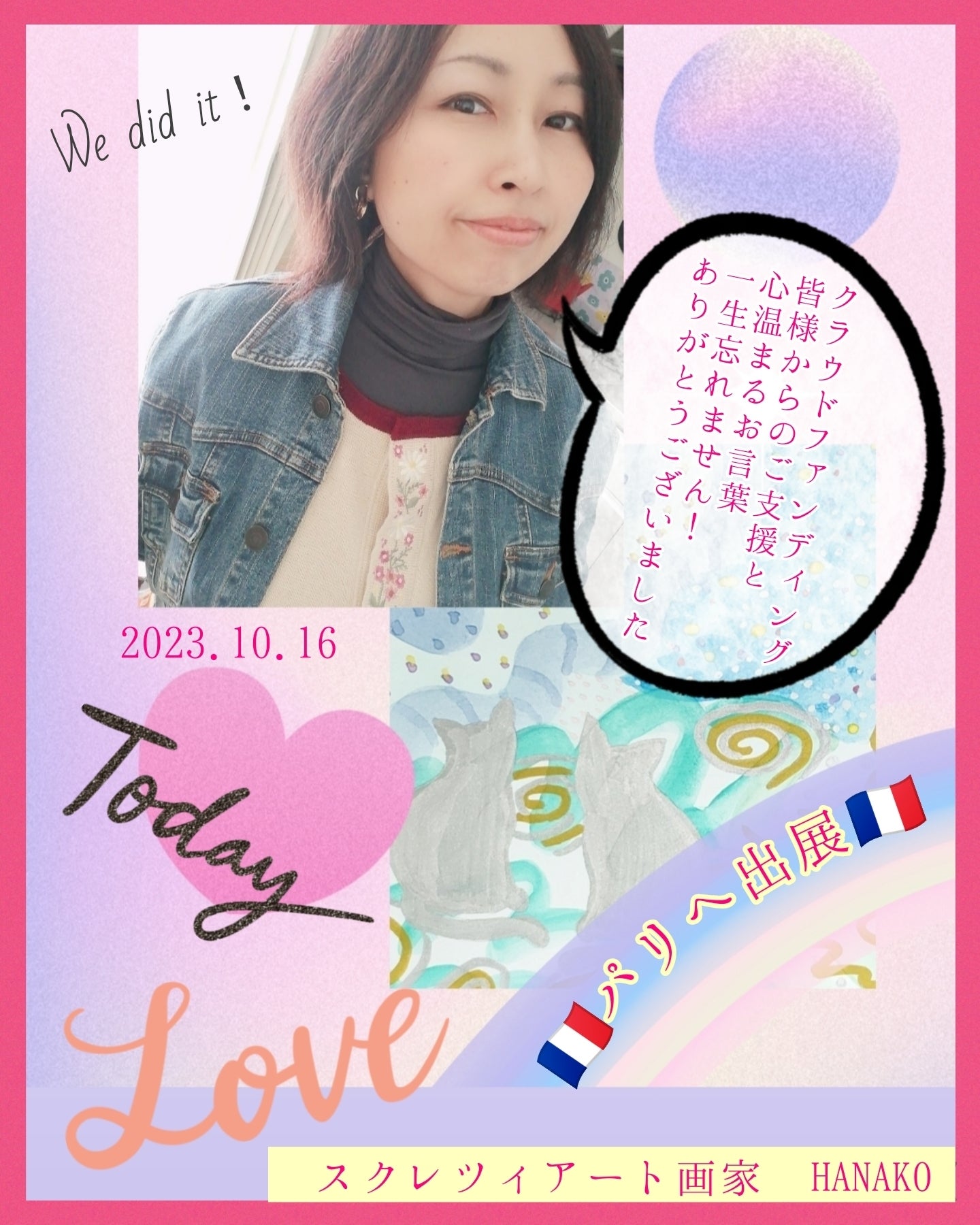 【世界芸術競技in PARIS】 夢を掴んだシングルマザー画家のパリ初出展!スクレツィアート画家 HANAKOです昨日無事にプロジェクトを終える事ができました。この度は、プロジェクトをご支援して頂いた皆様方には心より御礼申し上げます。そして陰ながら応援し、エールを送って下さった皆様にも感謝申し上げます(^^)目標金額には届かなかったものの、¥175000円という ありがたい金額のご支援を賜ることができ、感謝の気持ちでいっぱいです!今回の最大の目的であった「出展費用」の件ですが、詳細をお話しますと、出展費用は2ヶ月前に小額の内金を納めており、残金はあと¥248000。その他、キャンプファイヤーへの手数料が引かれますが、この度の皆様からのご支援して頂いた金額は、出展費用への大いなる足しとなり、大変助かりました!あとは自分の趣味や家計で削れるところは削りますので、そうしましたら何とか\\出展費用を払えそうです!!//これもひとえに皆様のお陰です(^^)この御恩を忘れずに、パリに私オンリーワンの作品を届けます!「日本からパリへ!そしてパリから世界へ!」私のスクレツィアート画とその絵に込めたメッセージを多くの人々に広めてゆきます。尚、本プロジェクトの目的である「出展費用の支払い」が今月の27日なので、支払いが終わりましたら、その進捗や状況を、プロジェクトページの「活動報告」にて投稿していきます。〜ご支援者様へ〜※リターンについてのインフォメーションも「活動報告」のページや、個別にメッセージボックスからお声がけ致します。暫しお待ちくださいませ(^^)この度は誠にありがとうございましたm(_ _)m皆様の益々のご健康とご多幸をお祈り致しております。 HANAKO