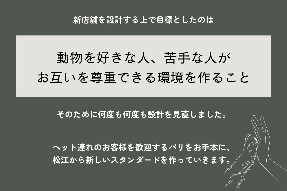 ペット同伴について賛否両論あるのは十分わかっていますが、地元で15年も愛されてきたナテュールだからこそ、お客様と一緒に取り組める新事業だと思っています。開放的で多様な価値観を認め合うパリをお手本に「こうあるべき」という固定概念を脱ぎ捨て、ナテュールから新しい価値を生み出していきます。