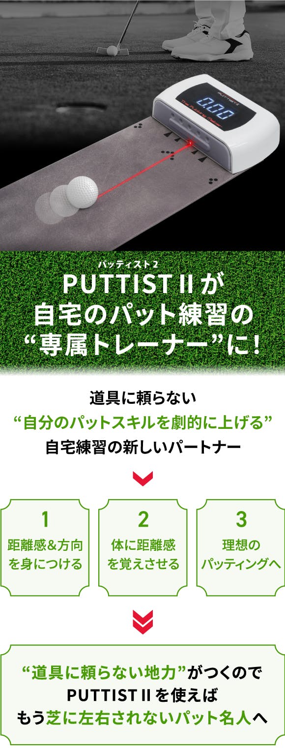 PUTTISTⅡは、自宅にいながらにして「20mのグリーン練習環境」を再現できる超精密センサー搭載のパッティング練習機です。