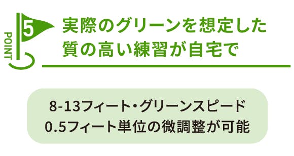 PUTTISTⅡは「室内で8〜13フィートまでの距離の練習を」というコンセプトで実際のグリーン環境下の想定にこだわっています。 グリーンスピードを0.5フィート単位で調整することができます。