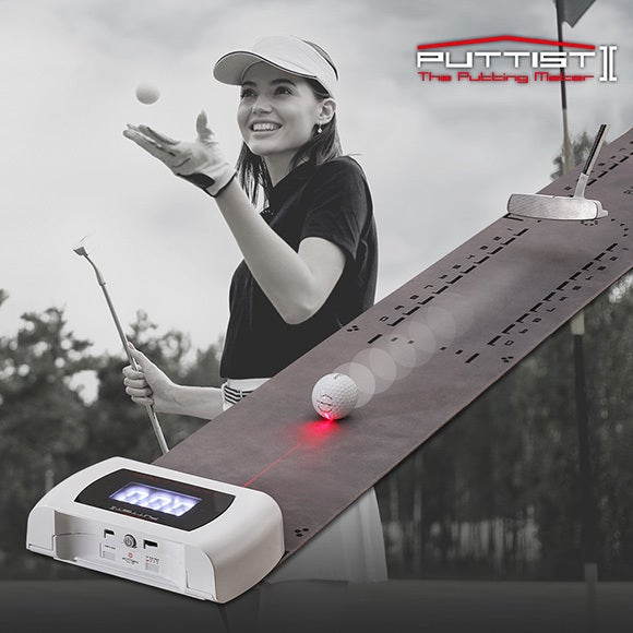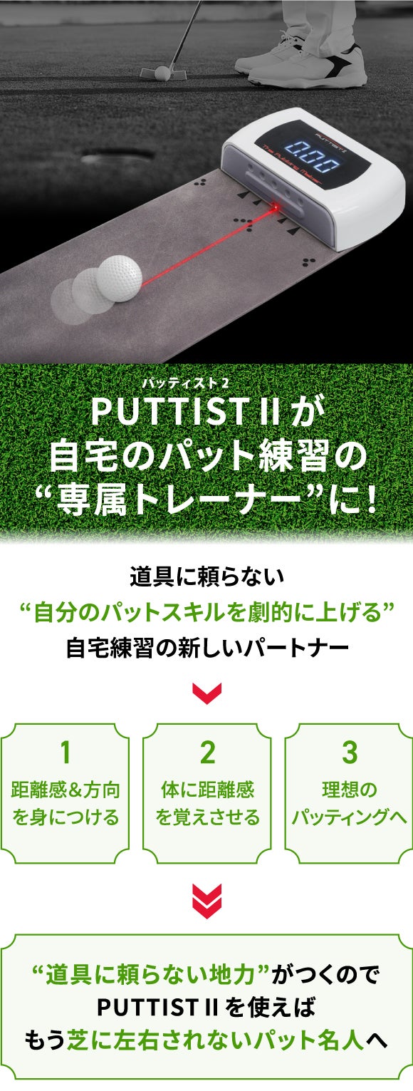 PUTTISTⅡでは、ディスプレイ面積を広げて見やすくしたばかりか、レーザー機能で方向性のトレーニング、過去15メートルだった測定距離を20mまで拡張してロングパットの練習にも対応させました。 また、色んな所で練習したい!という要望に応えてバッテリー式にして好きな場所で練習することができるようになりました。そしてなんといっても極めつけは過去最高難易度の20メートルまでの9個のランダムモードを搭載させました! 9回連続させることができればもうグリーンの上でパットに不安をもつあなたはいなくなること間違いありません!