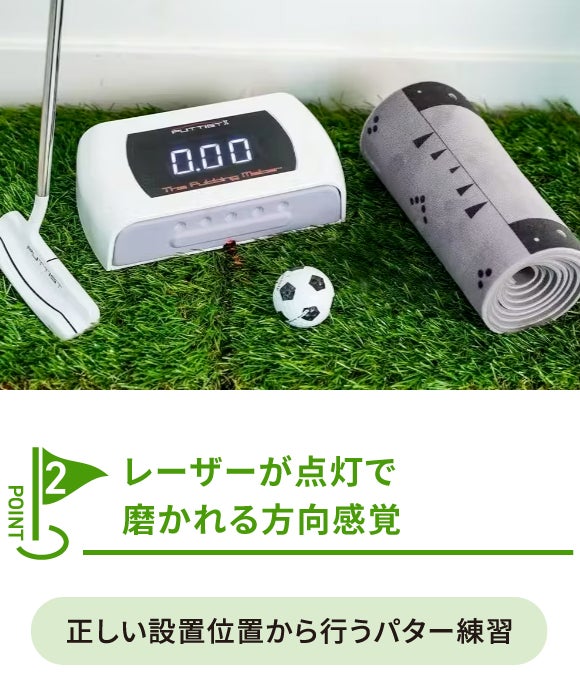 レーザーが点灯することで正しい位置にボールをセットすることができます。 わずかの差で大きく曲がってしまうのがパターの難しさです。“ボールの位置を正確”に毎回行う事で精度の高い練習が出来ます。 また、打った際もボールレーザーの当たる位置で方向性を確認しながらパター練習ができます。