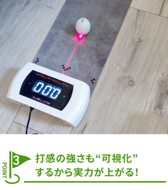 そのときにこの商品に出会いました。距離をデジタルで正確に計測してくれますので、室内でバーチャルなパター練習がゲーム感覚で実現いたします。