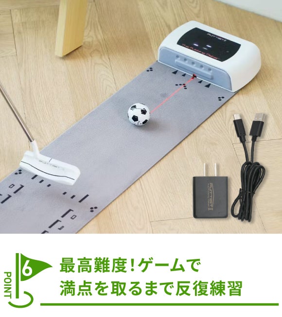準備はPUTTISTⅡとボール1つでOK。距離感と方向を毎打ごとに数値で表示してくれるので、やればやるだけ“距離感”と”方向感覚”が身に付きます。スイートスポットにしっかり当てて真っすぐ飛ばす快感を、自宅に居ながらにして練習ができる優れものです。 簡単なセットアップで3種類のグリーンスピード設定と5種類のゲームを楽しみながら反復練習できるので「おきもの」になる心配もありません!