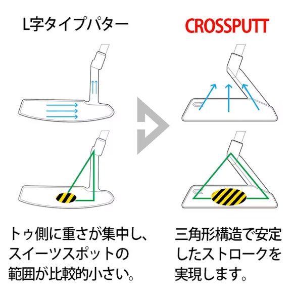 CROSSPUTTパターは、まっすぐ引いてまっすぐ打つことに特化しています。 トゥ側が上がっていることで、フェースが開閉しなくなり、きれいなストロークに自然となります。