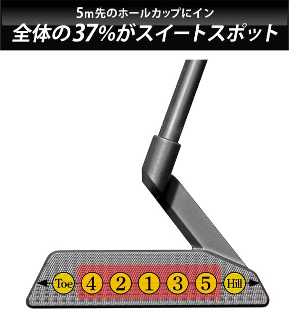 ①を中心に左右10mm間隔でパッティング実験を実施。 フェースの幅は115mmとなっており、そのうちの40mmの間(全体の37%)を打てば真っ直ぐに転がりカップインすることが実験結果から実証済みです。
