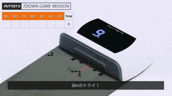 9m / 8m / 7m / 6m / 5m/ 4m / 3mの順序でトライして何回成功したかを判断するモードです。目標距離を超えて50㎝以内に打てた時、成功と判断されます。成功した回数がスコアとなります。